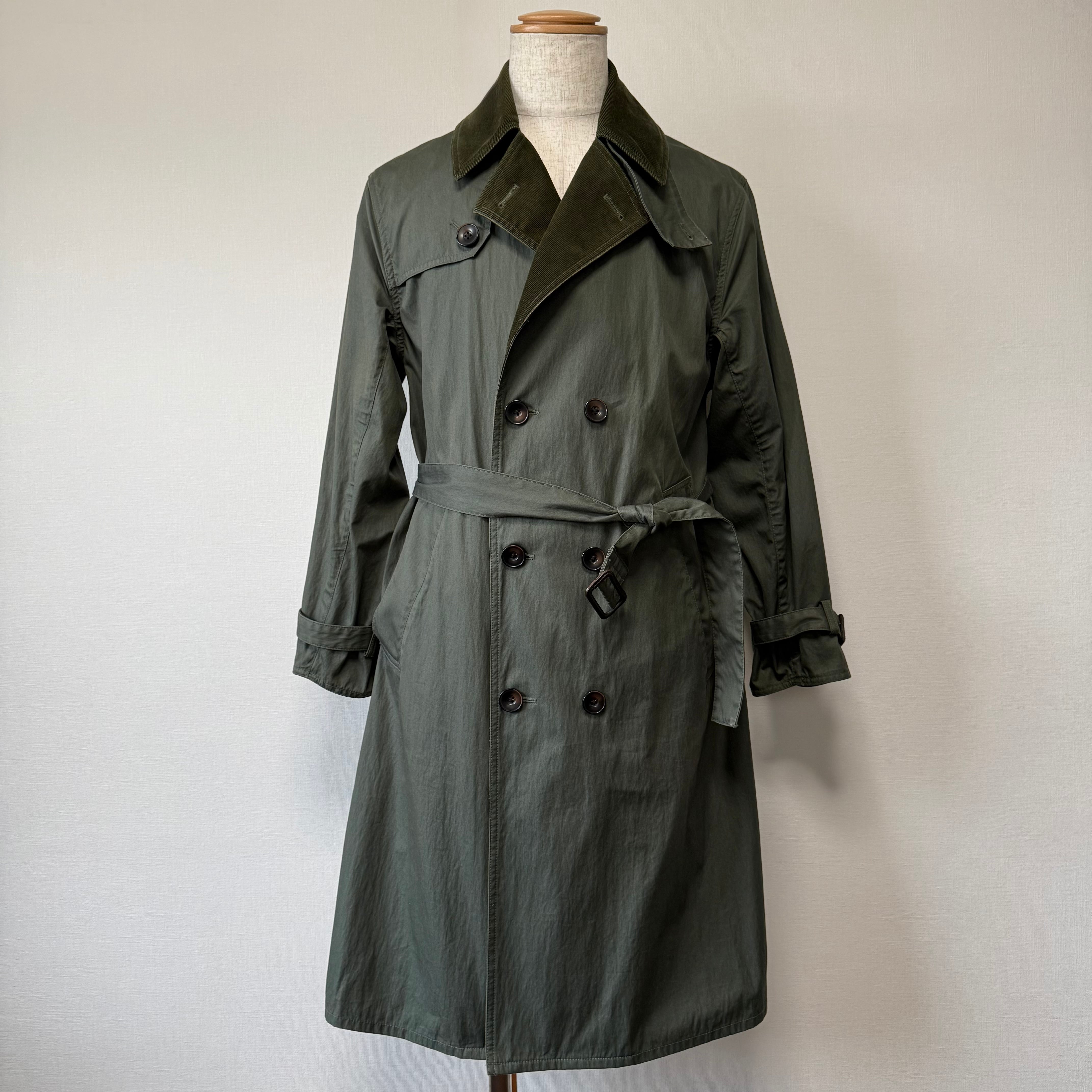 バブアー名作≪ウィットレー≫の復刻モデル別注トレンチコート。 生地は、ノンワックスドのコットン×ナイロン。適度な張りと僅かなストレッチ性があり、ラフな印象を引きたてるワッシャー加工が施されております。 また、背裏地と袖裏地も省いた仕立ては、軽量な着用感と持ち運びのしやすさが特徴。 生地風合いと仕様を踏まえると、秋口から初冬さらに春先までの着用に最適。 バブアーらしいコーデュロイ素材の襟周り、クラシカルな印象の釦デザインとコンパクトなフロント配列。 加えて、ガンフラップ/スロートラッチ/カフストラップ/ウエストベルト/アンブレラヨークなどのトレンチコートデザインも採用。 ブランドアイデンティティとミリタリーディティール詰まった一着です。 全体は、裾に向かって僅かに広がるゆとりある身幅、膝下程に至る長め着丈のAラインシルエット。 スーツ・ジャケットのドレススタイルからリラックスしたカジュアルスタイルまで幅広いシーンで着用が出来る、普遍的デザインのクラシックコートです。 ブログにてご紹介しております。 ☞☞ https://kakkootrclth.fashionstore.jp/blog/2026/02/16/155330 【ブランド】 Barbour × BEAMS F 【モデル】 Whitley 【サイズ】 34 【実寸】 肩幅47cm 袖丈59cm 胸囲54cm 身幅58cm 着丈105m ※ 商品実寸を平置きにて採寸しております。若干の誤差はご容赦ください。画像内Mサイズ相当トルソーが着用。 【カラー】 セージグリーン 【素材】 コットン70%、ナイロン30% 【生産国】 中国 【状態】 右肩にアタリがあります。 フロント第二釦に若干の緩みがあります。 他に大きく目立つ汚れやキズはなく、まだまだ着用出来る状態です。 ※撮影環境、パソコン等の閲覧環境により、色味が異なる場合がございます。予めご了承ください。 ※中古品の為、写真に映りきらない細かな汚れや擦れ、アタリ等が全て掲載しきれない場合がございます。 古着にご理解の上、ご購入ください。 ※トップページ内SHOPPING GUIDEをご確認の上、ご購入ください。