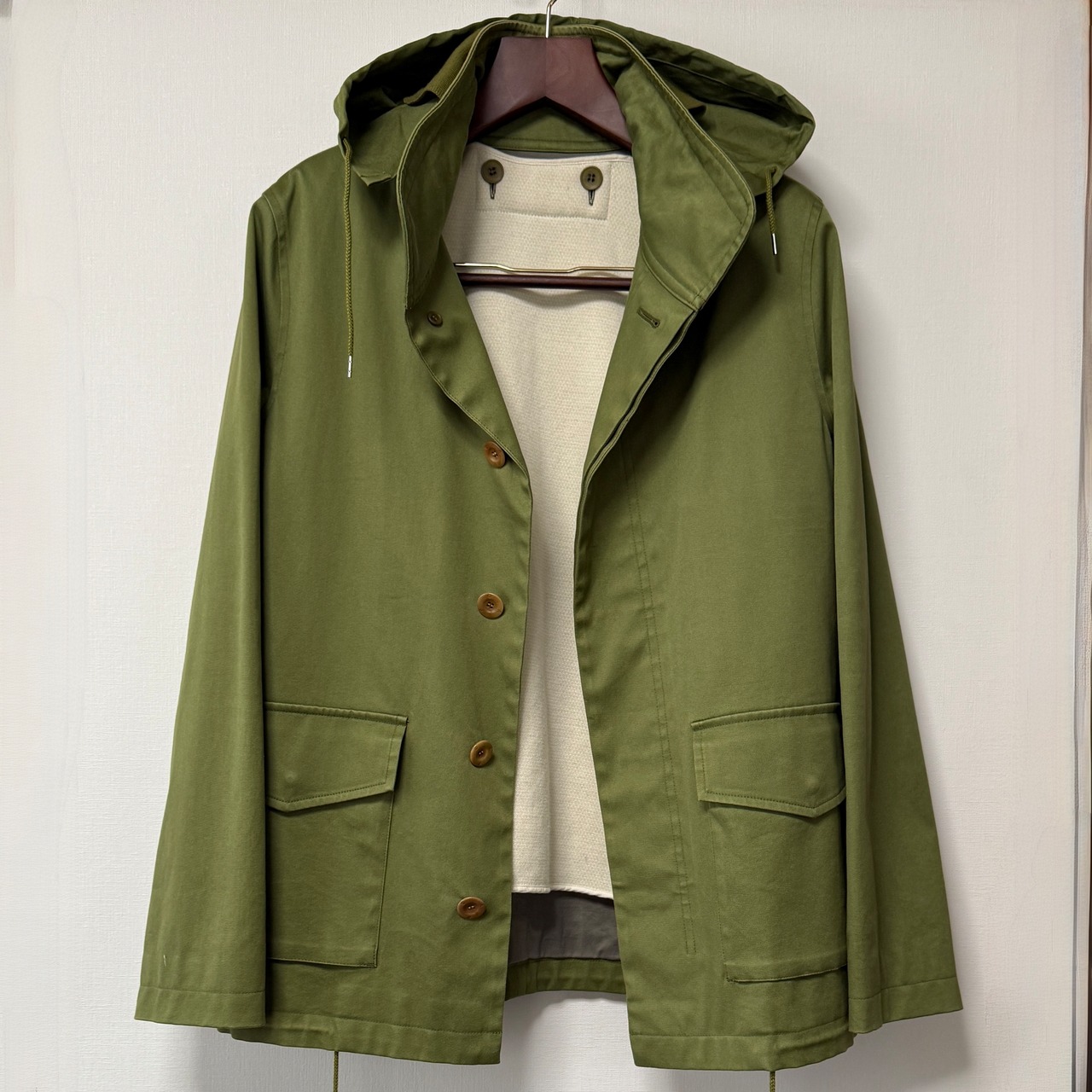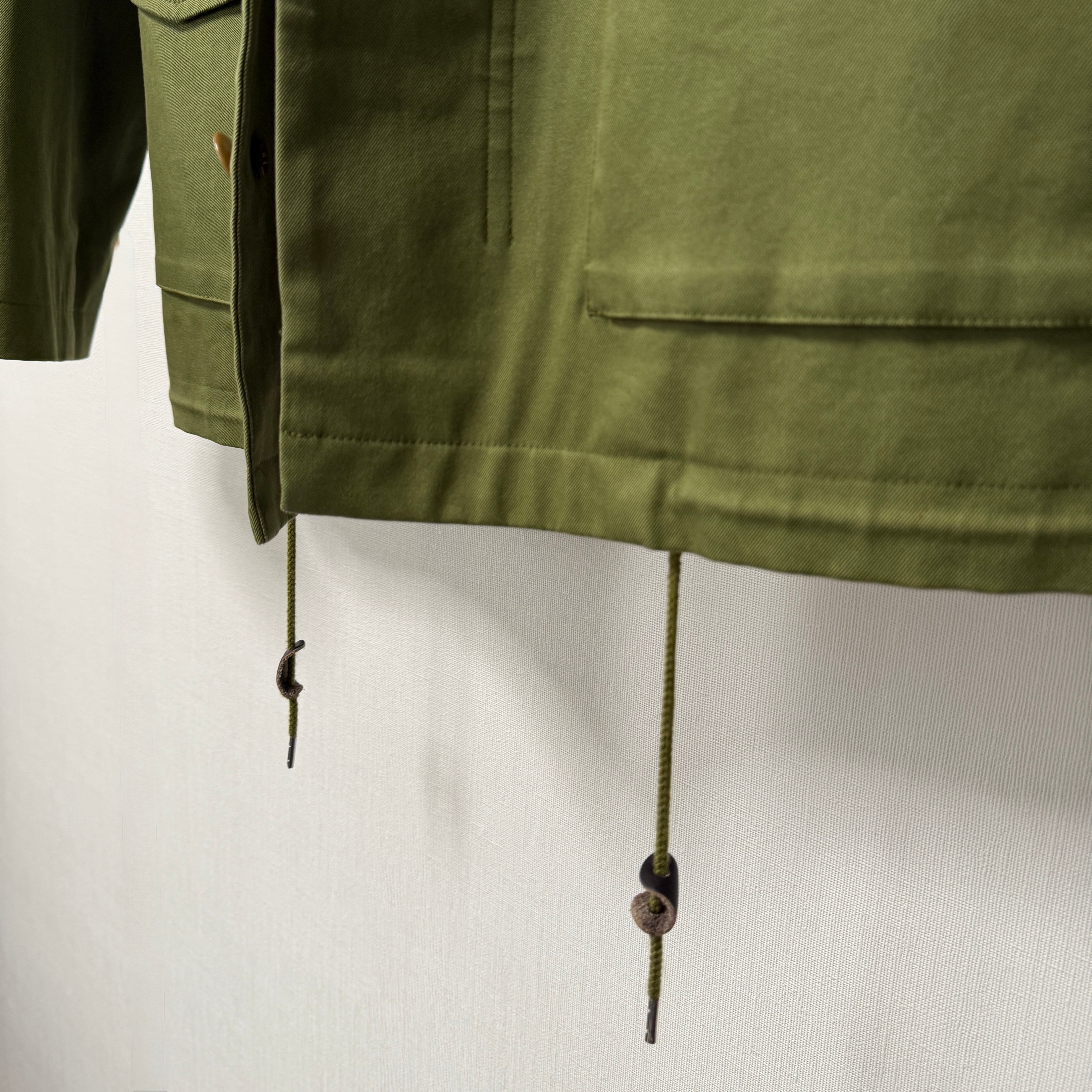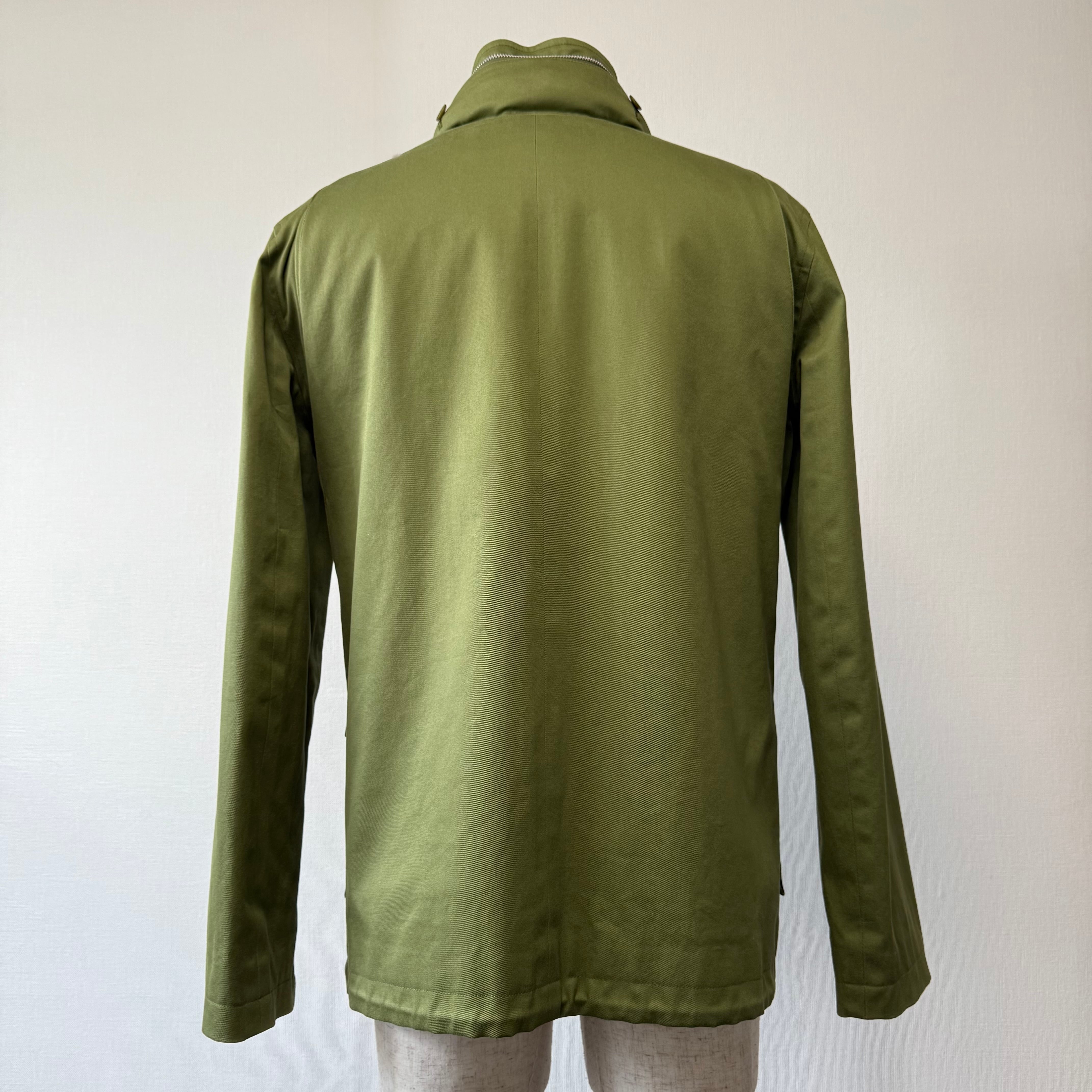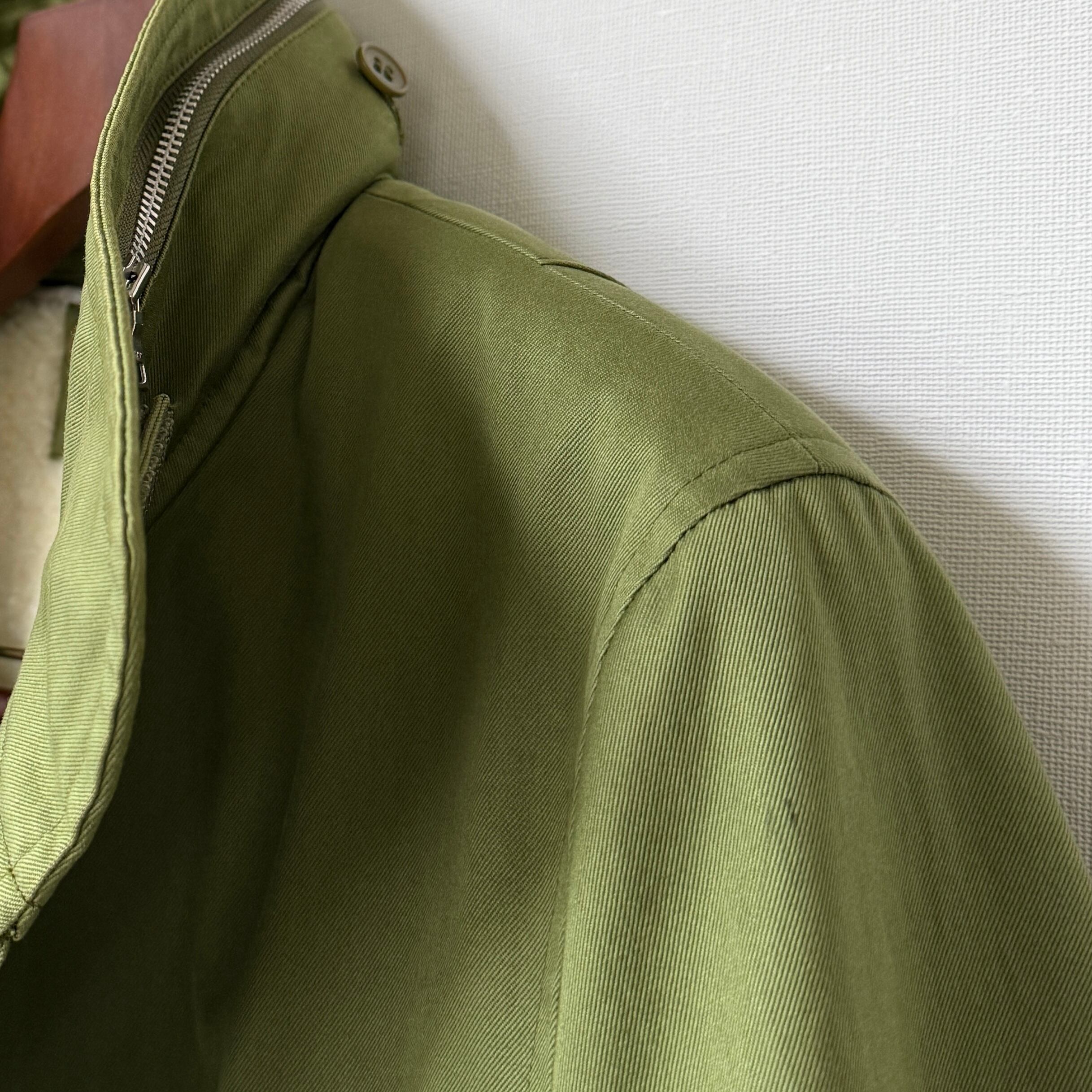 ミリタリーテイストに、都会的なフレンチエスプリのニュアンスも感じるカーキグリーンやボタンディテールが上品な印象の一着となっております。