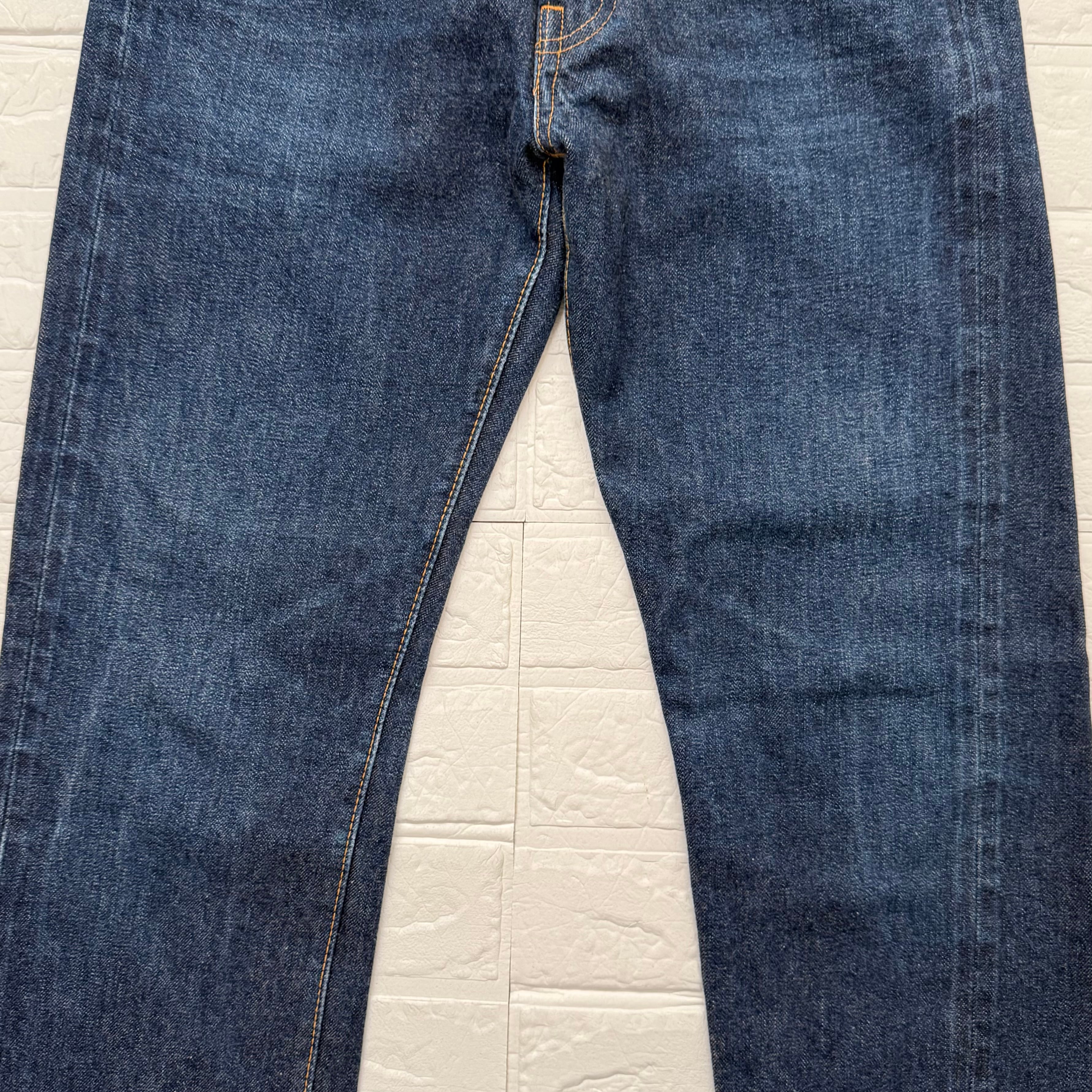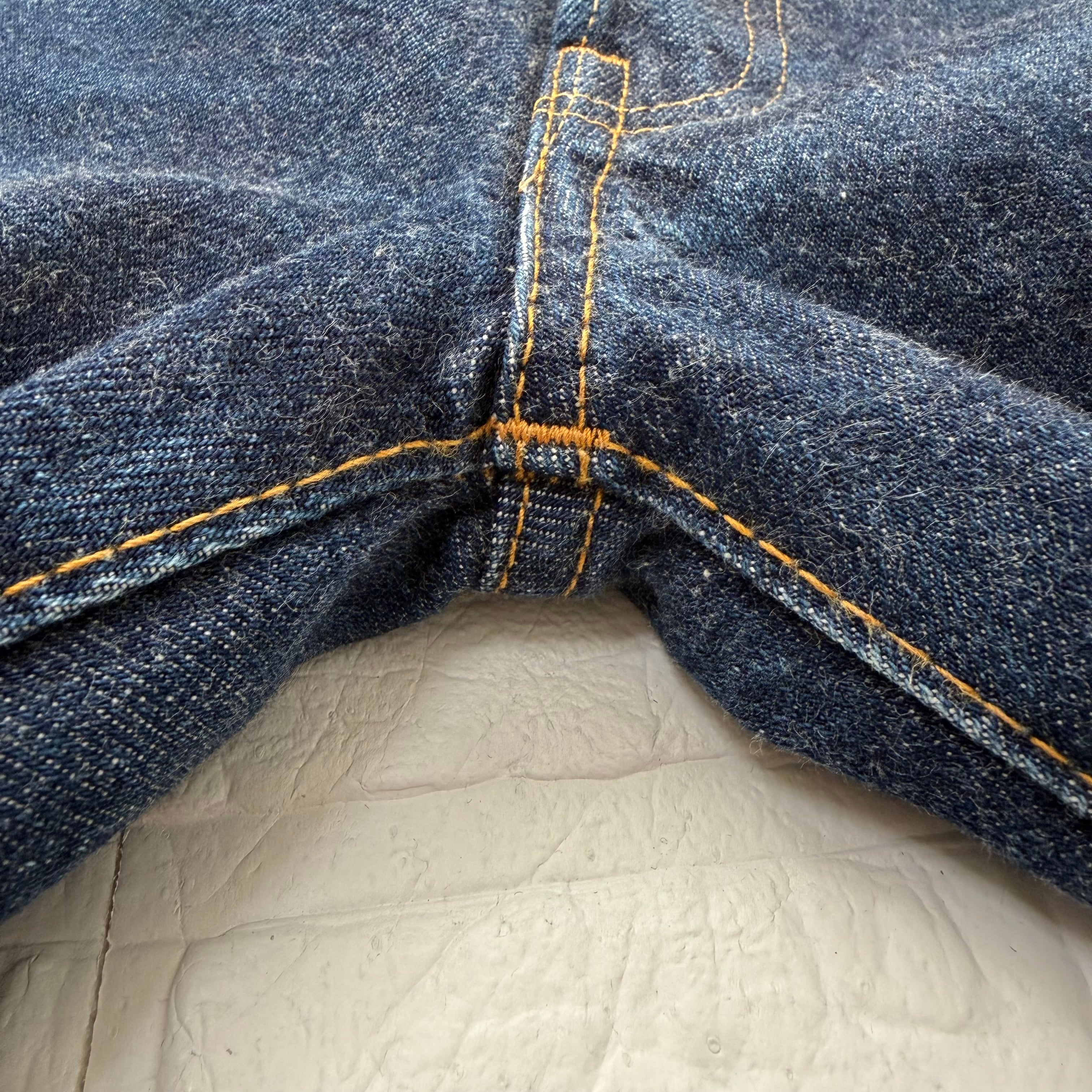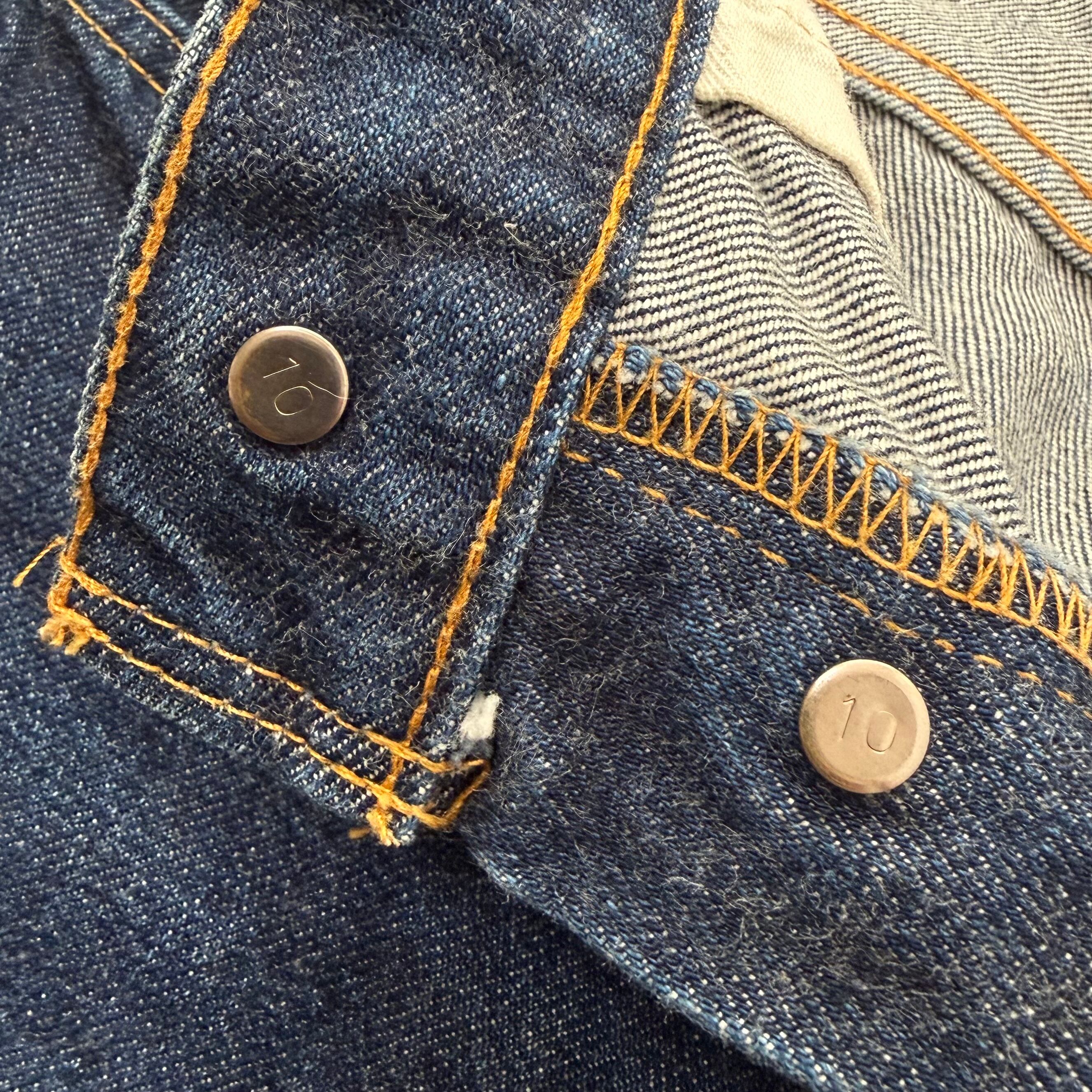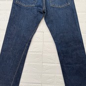 デニム地特有の擦れやアタリ、毛羽立ち、生地の捻りがあります。