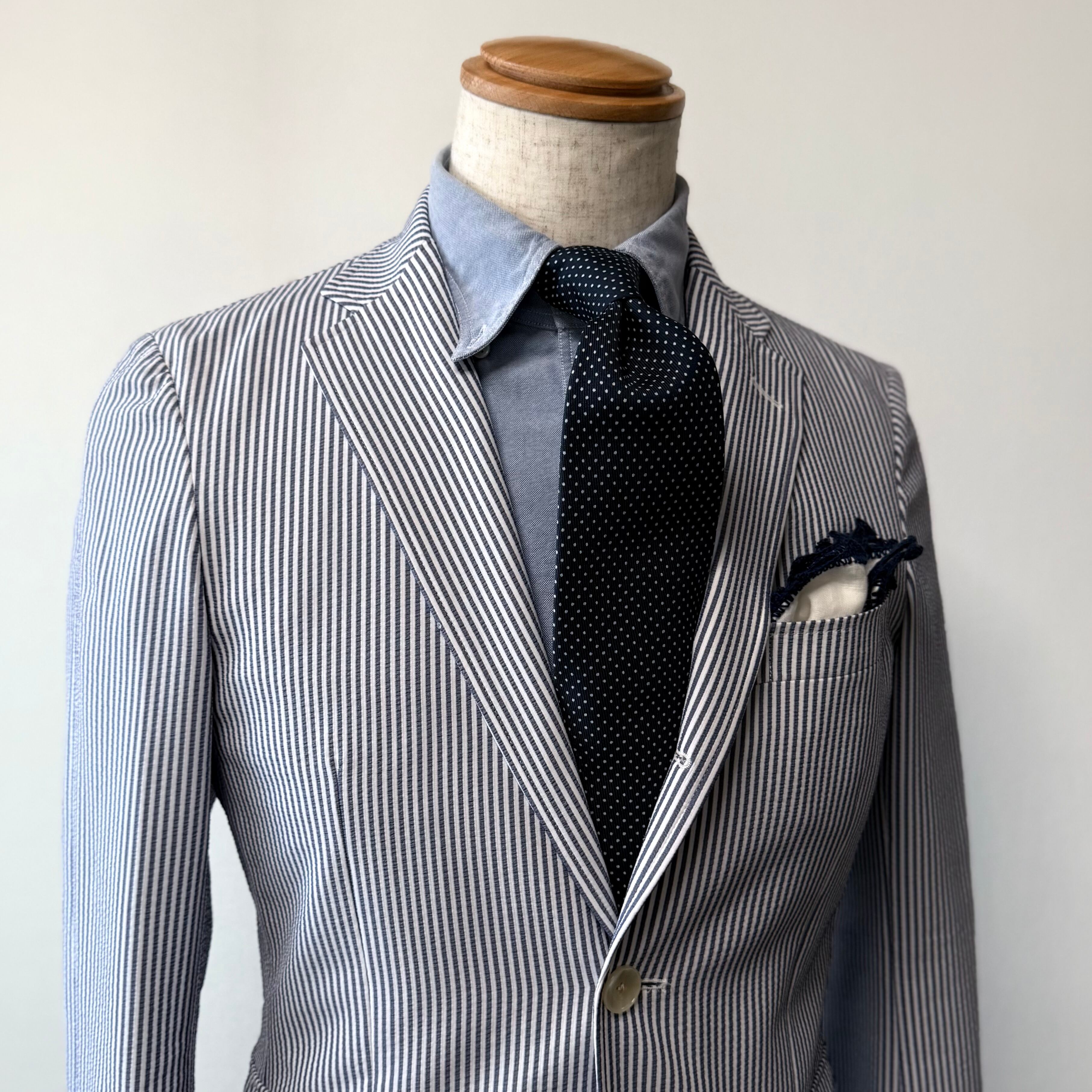 シンプルで纏まりあるスーツスタイルにおすすめの定番柄ネクタイです。