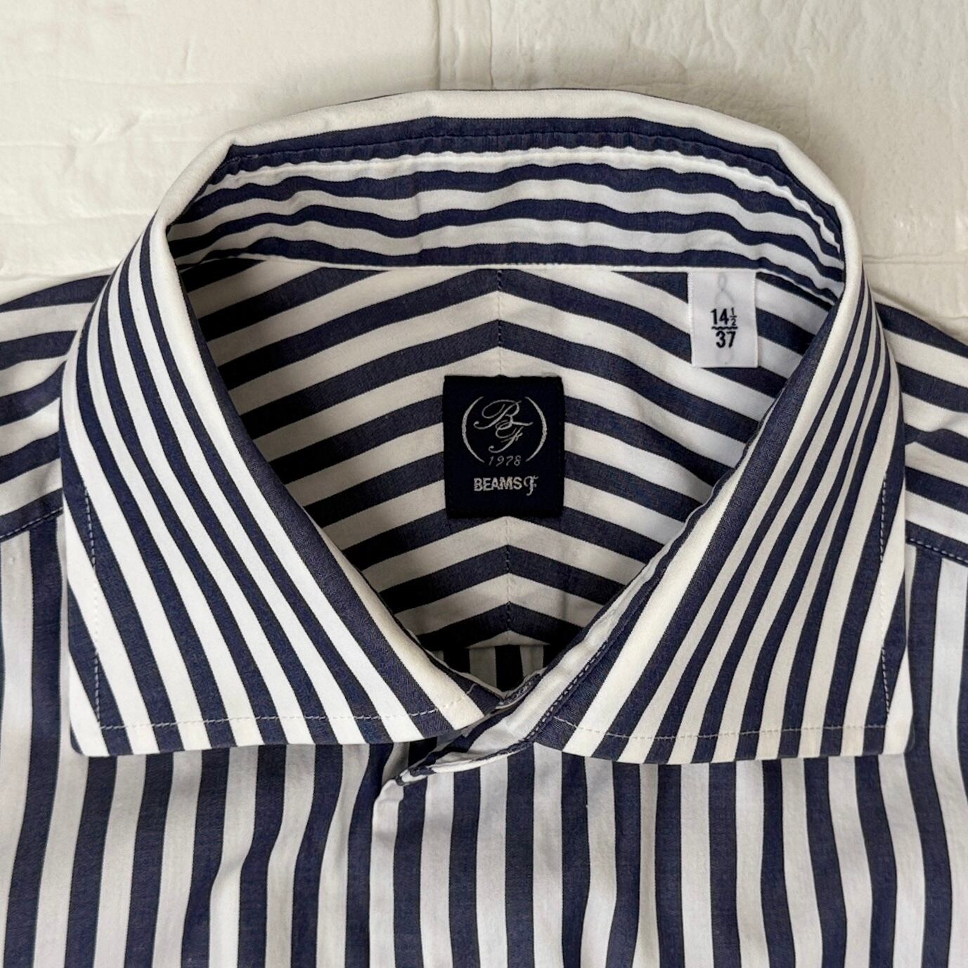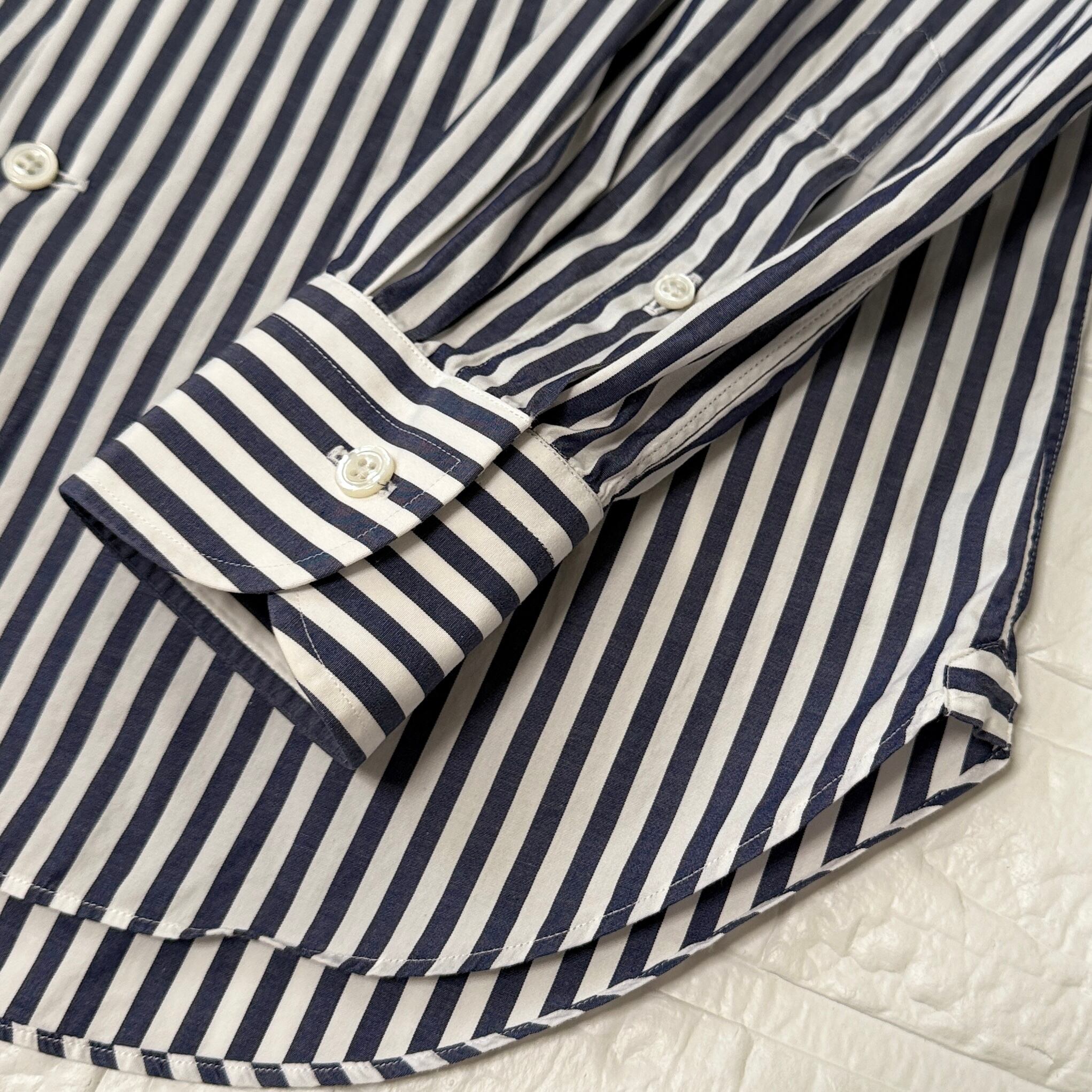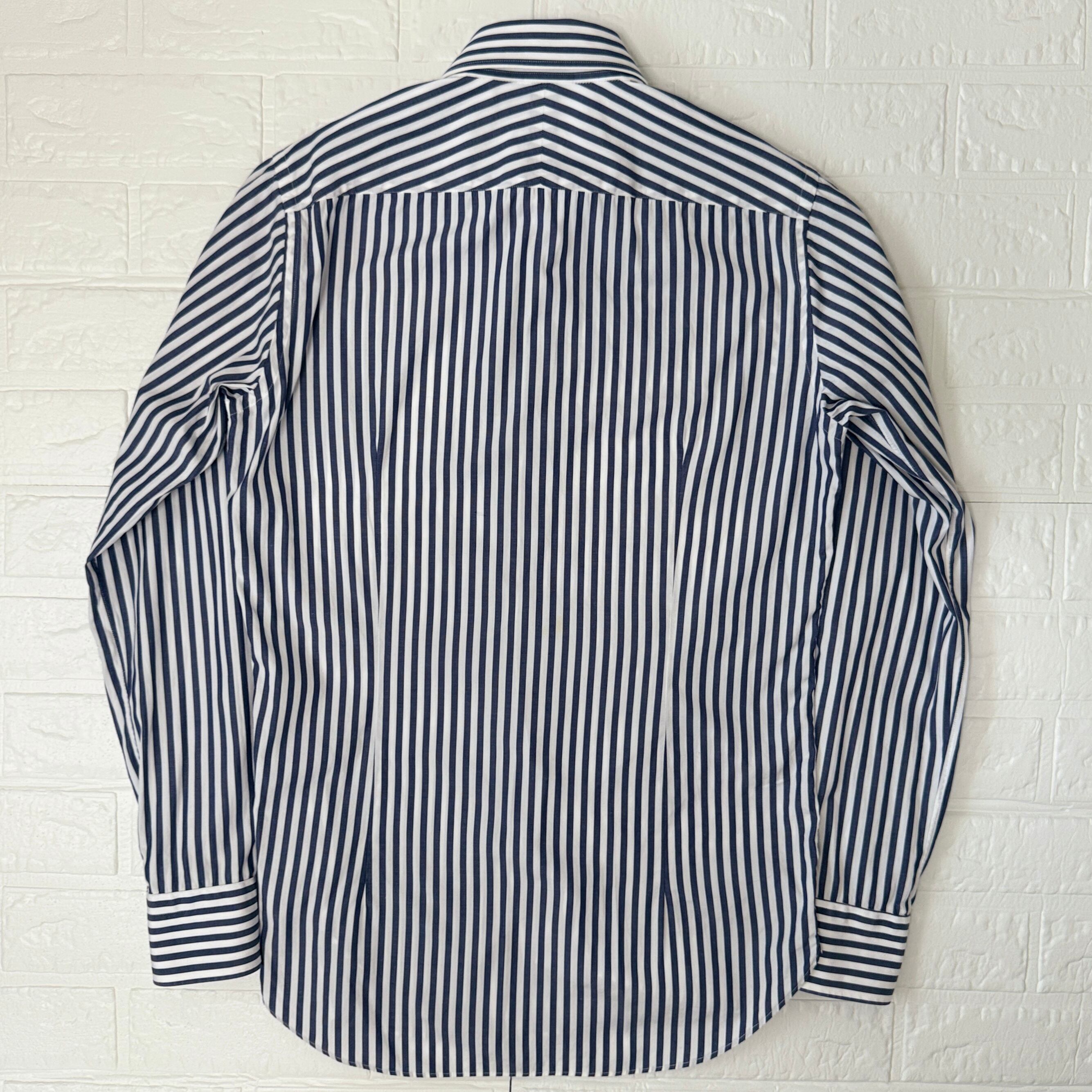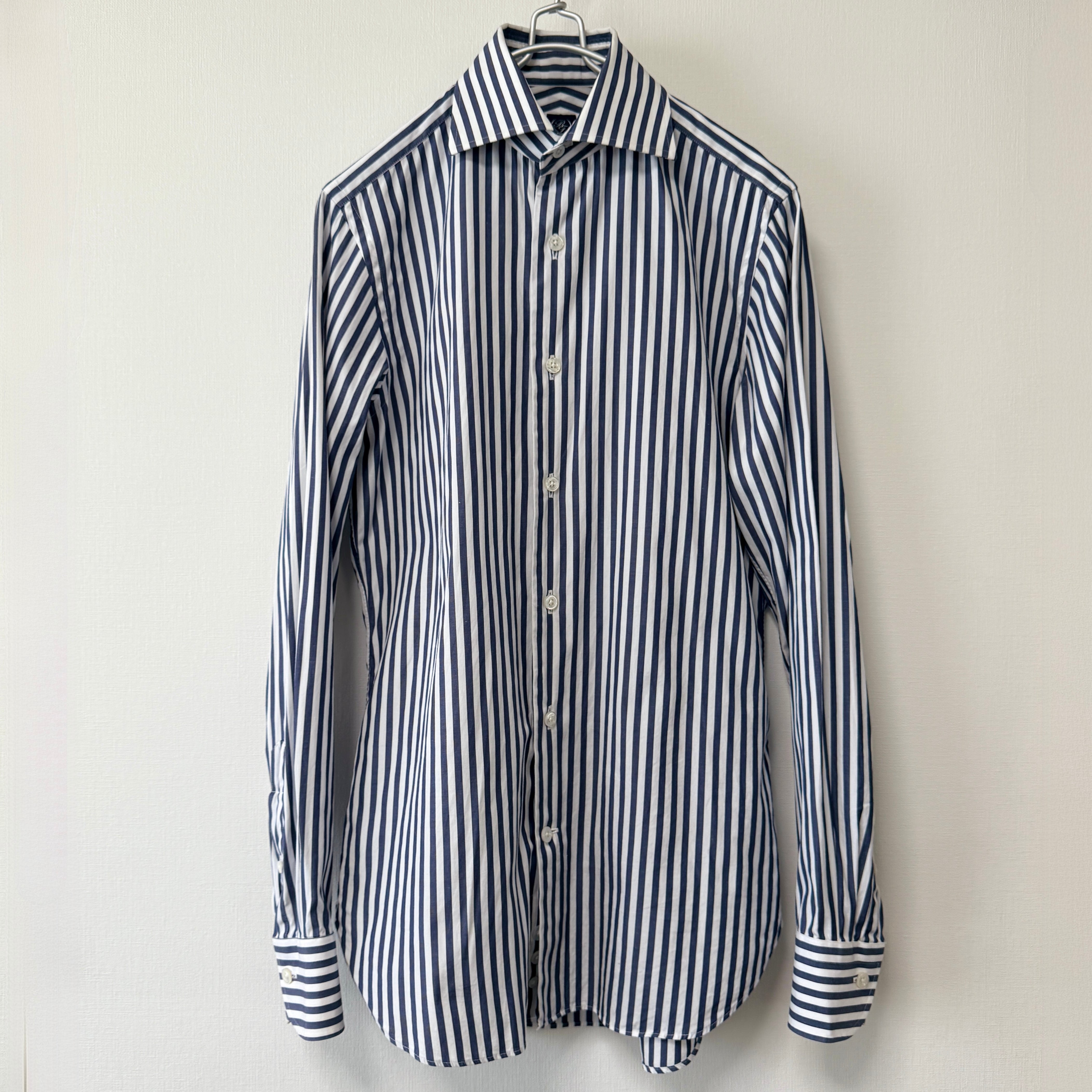 すっきりとした顔回りに映るセミワイドカラー、ピッチに個性があるボールドストライプ柄というオーソドックスなデザインが幅広いスタイリングに馴染む一着です。