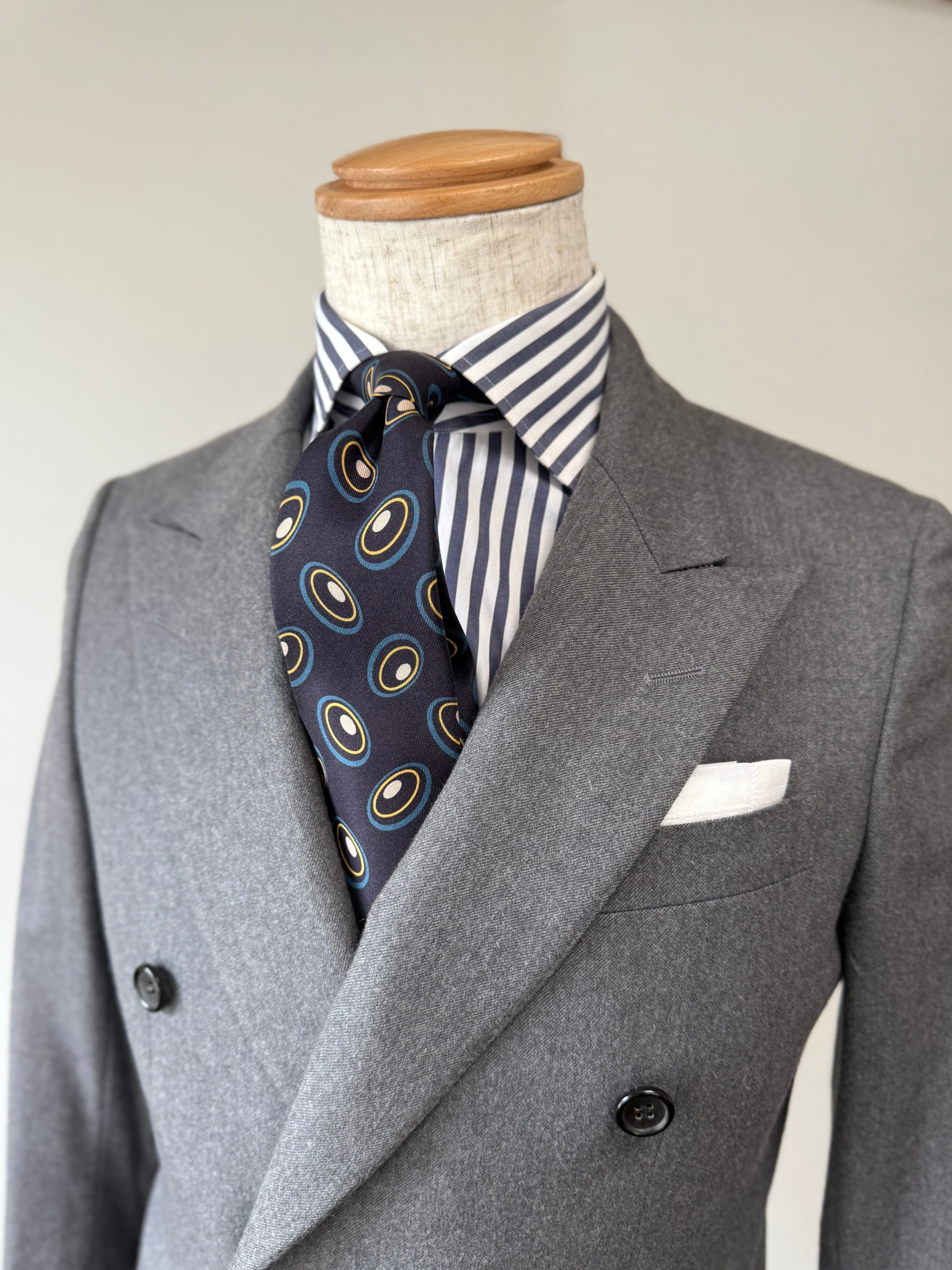 すっきりとした顔回りに映るセミワイドカラー、ピッチに個性があるボールドストライプ柄というオーソドックスなデザイン。
