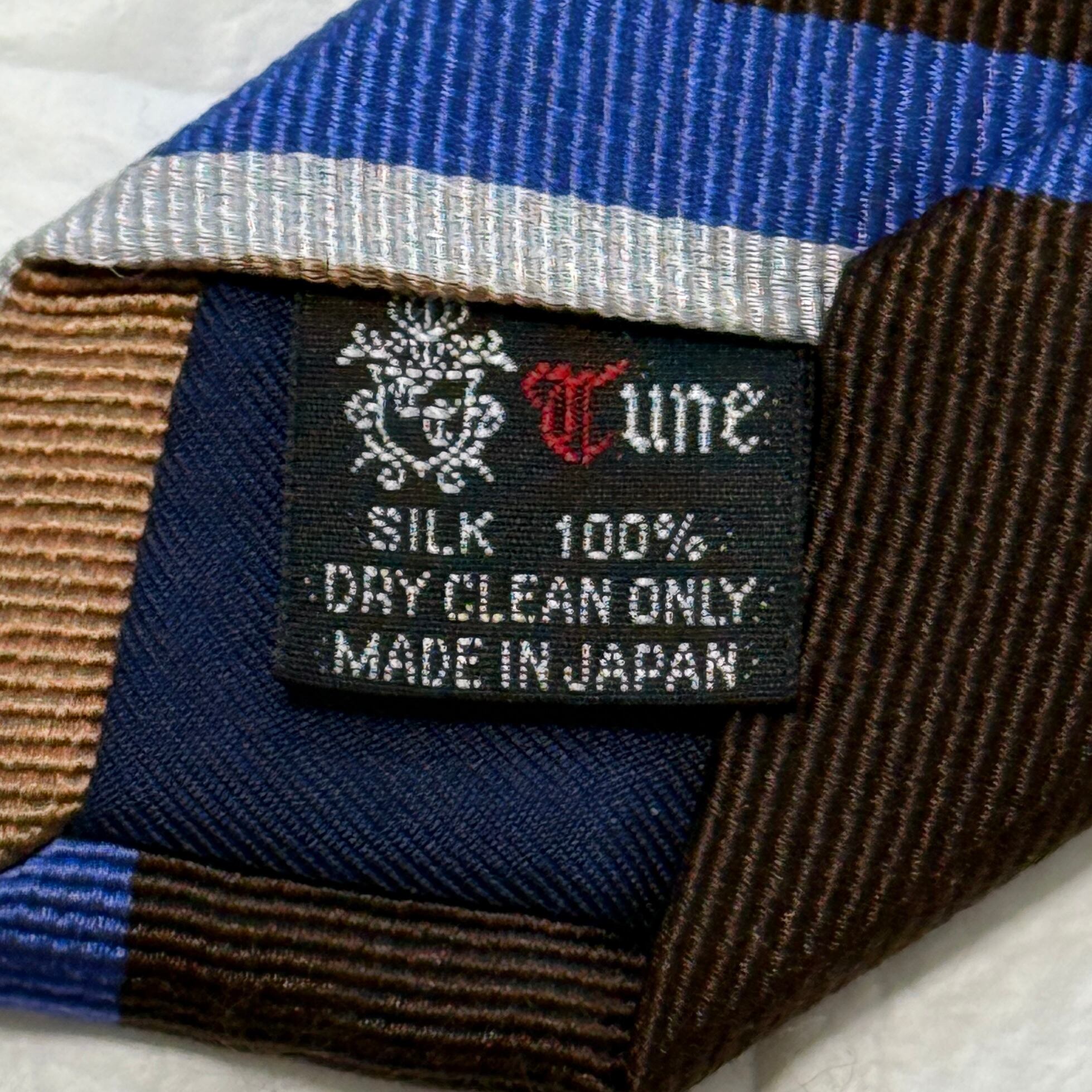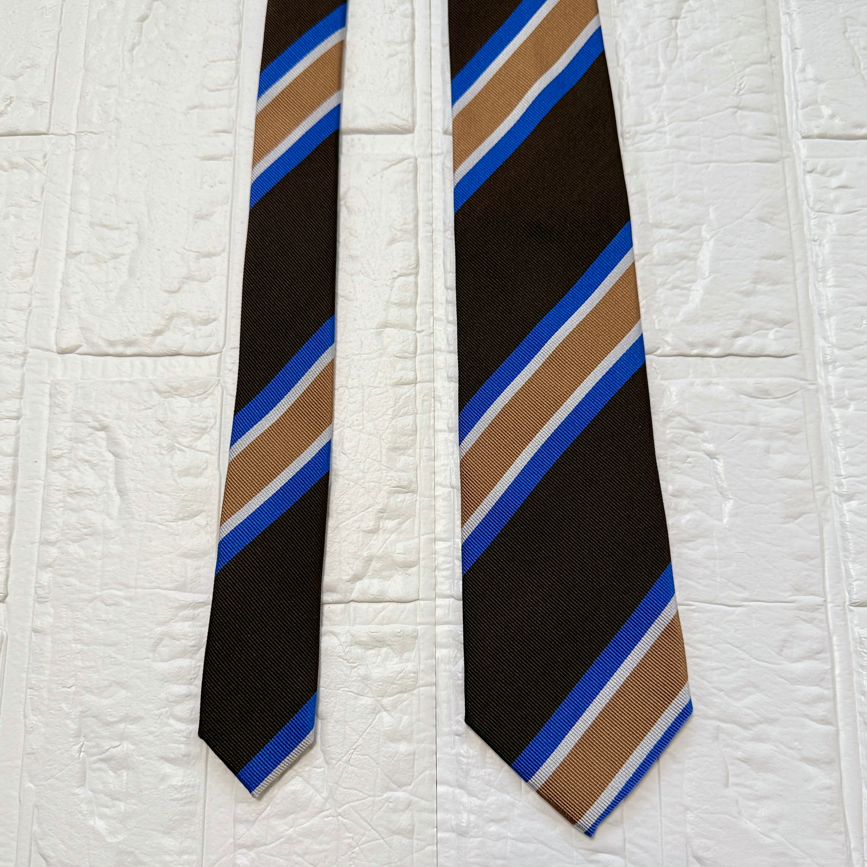 落ち着いたブラウンベースに品格あるゴールドと爽やかなブルーが配色されたストライプネクタイ。