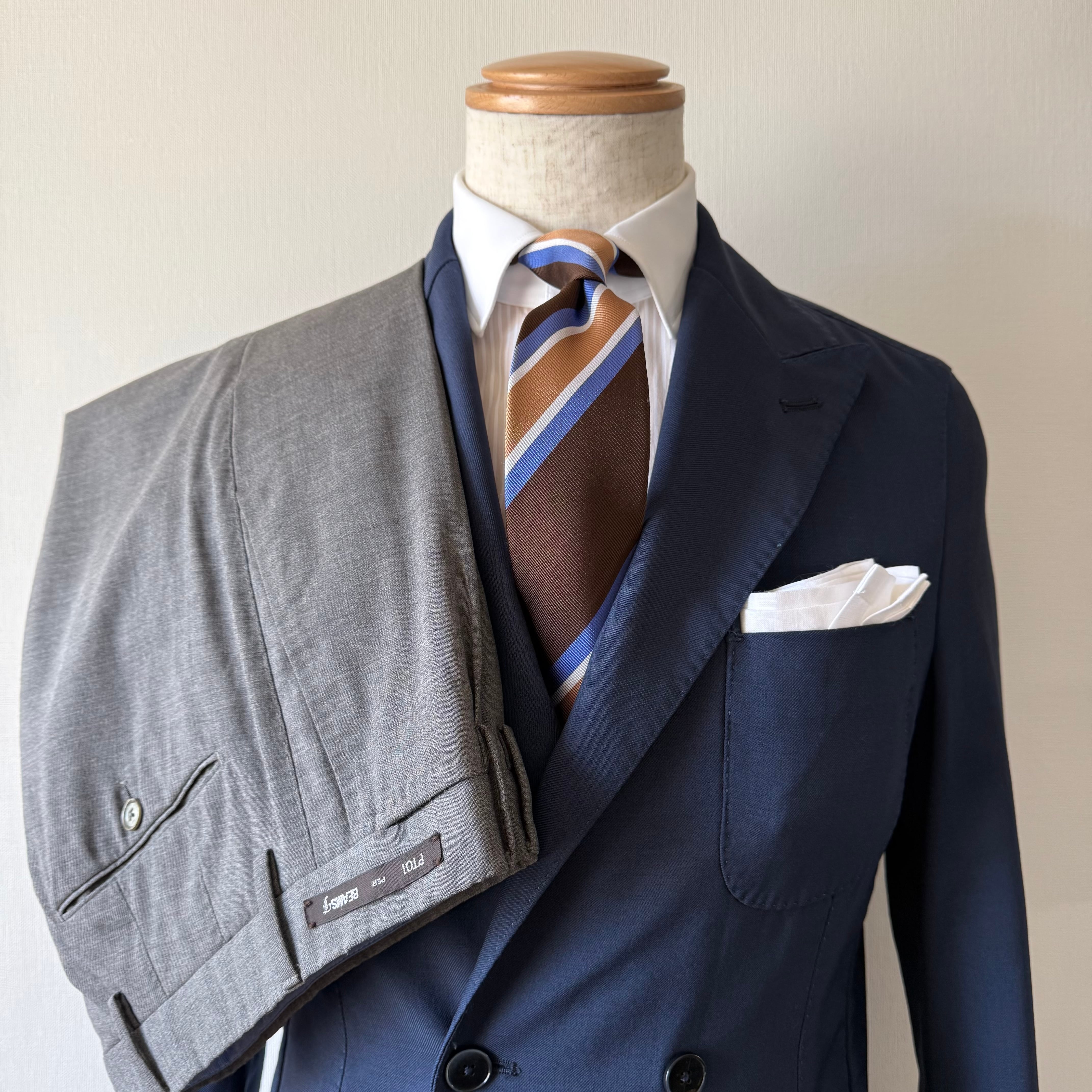 ストライプ間隔にもメリハリがついており、柄物ジャケットやシャツともコーディネートしやすい一本です。