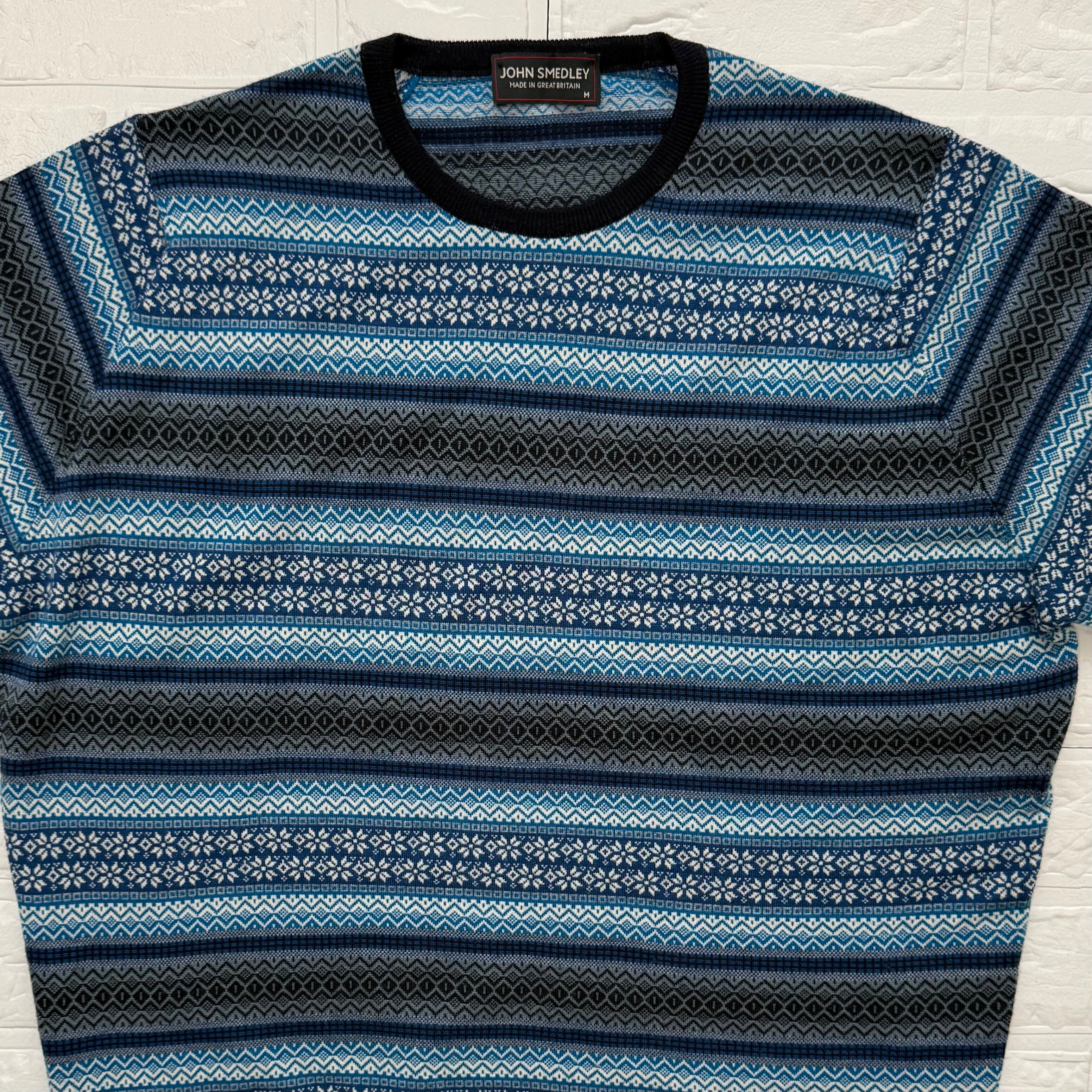 JOHN SMEDLEY フェアアイル柄 ハイゲージ クルーネック ニット (ネイビー、Mサイズ)