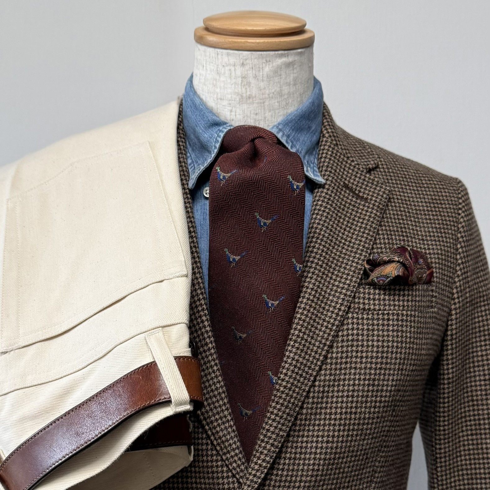 薄っすらと紫色のオーバーペインが差し込まれた千鳥格子柄(ハウンドトゥース柄)テーラードジャケット。