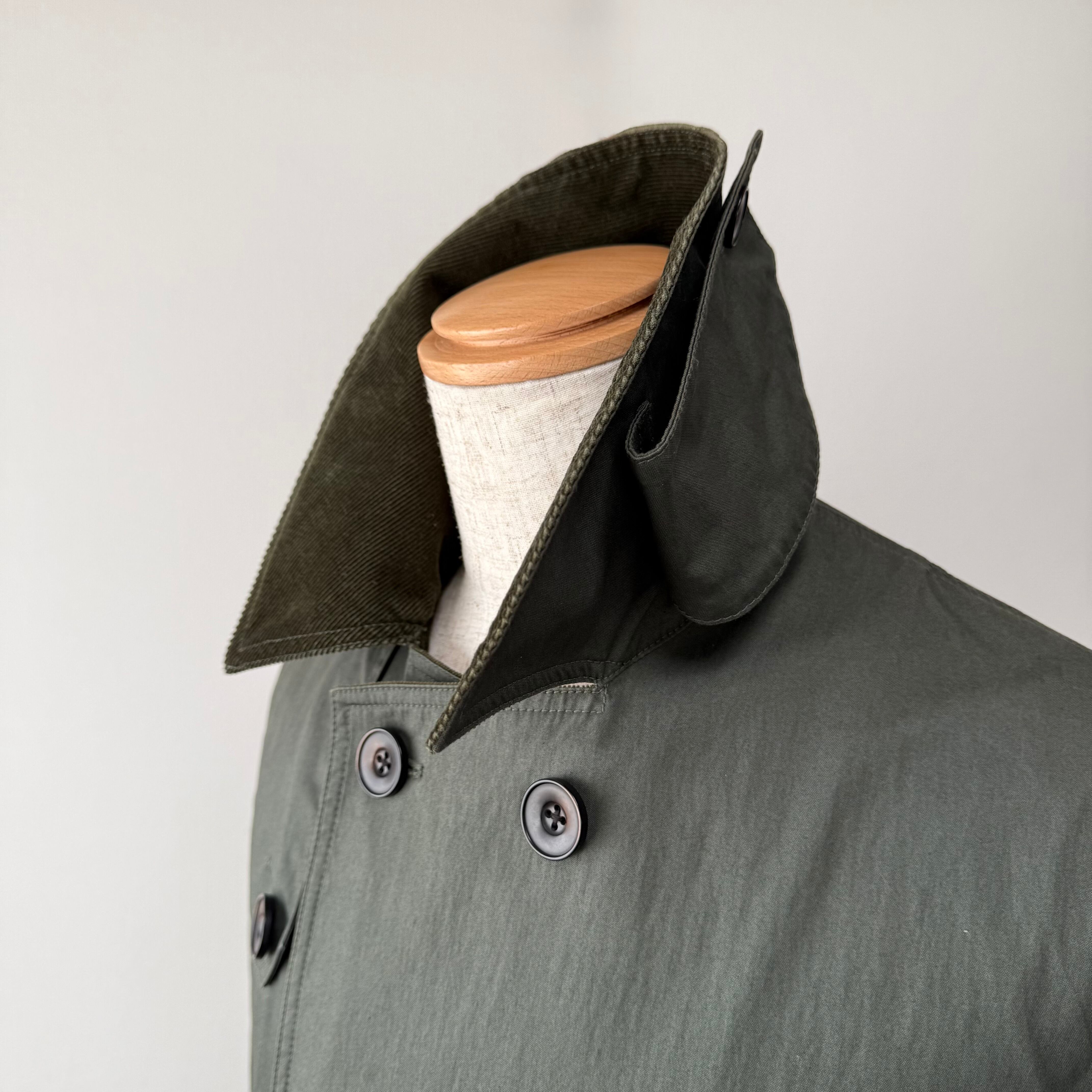 普遍的なデザインをベースに裾に向かって僅かに広がるゆとりある身幅や長めに取られた着丈となっており、ドレススタイルからリラックス感あるカジュアルスタイルまで幅広いシーンで着用いただけるコートとなっております。