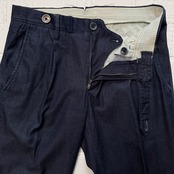 型は、1プリーツのスリムフィットとなります。ストレッチ性のあるコットン×ポリウレタン生地で春・秋・冬に向いた厚さの仕上がりです。