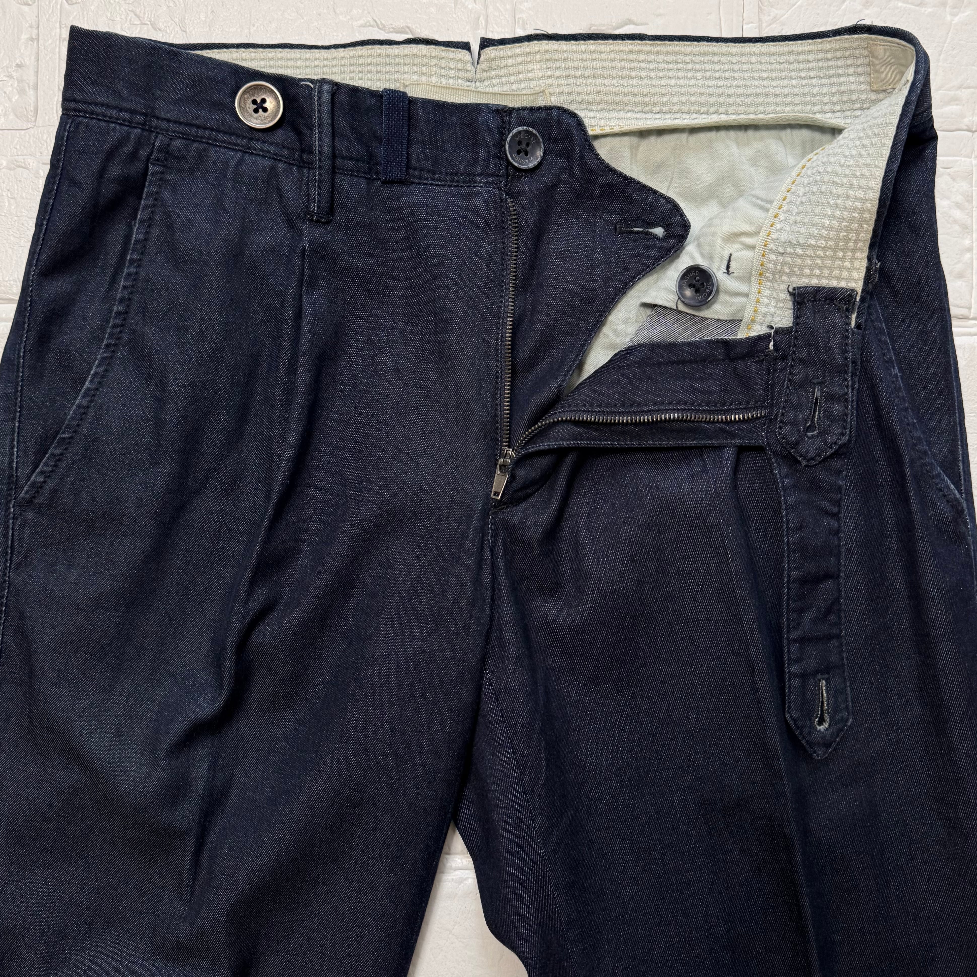 グルカパンツ風の長いフロント持ち出しが特徴的なデニムスラックス。
