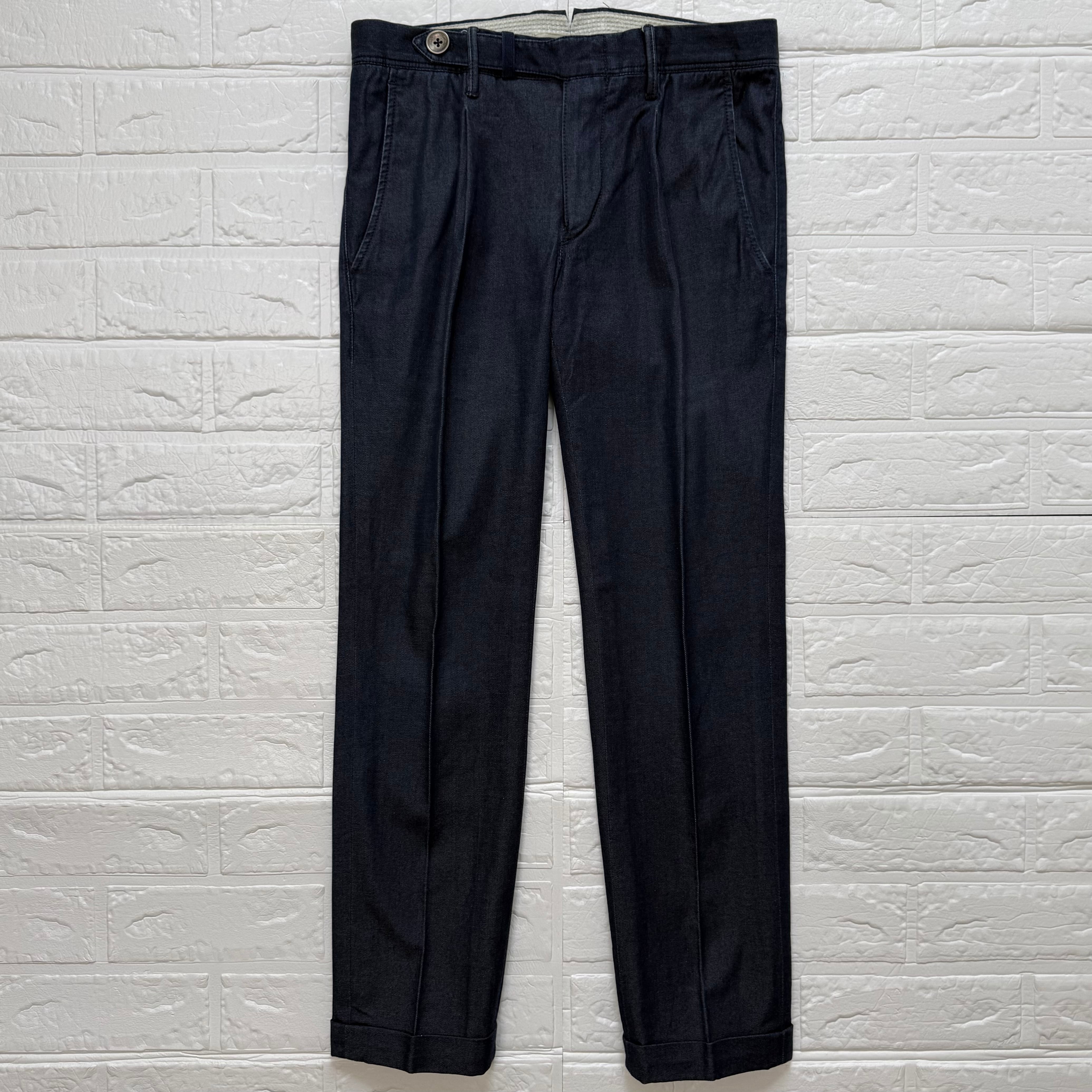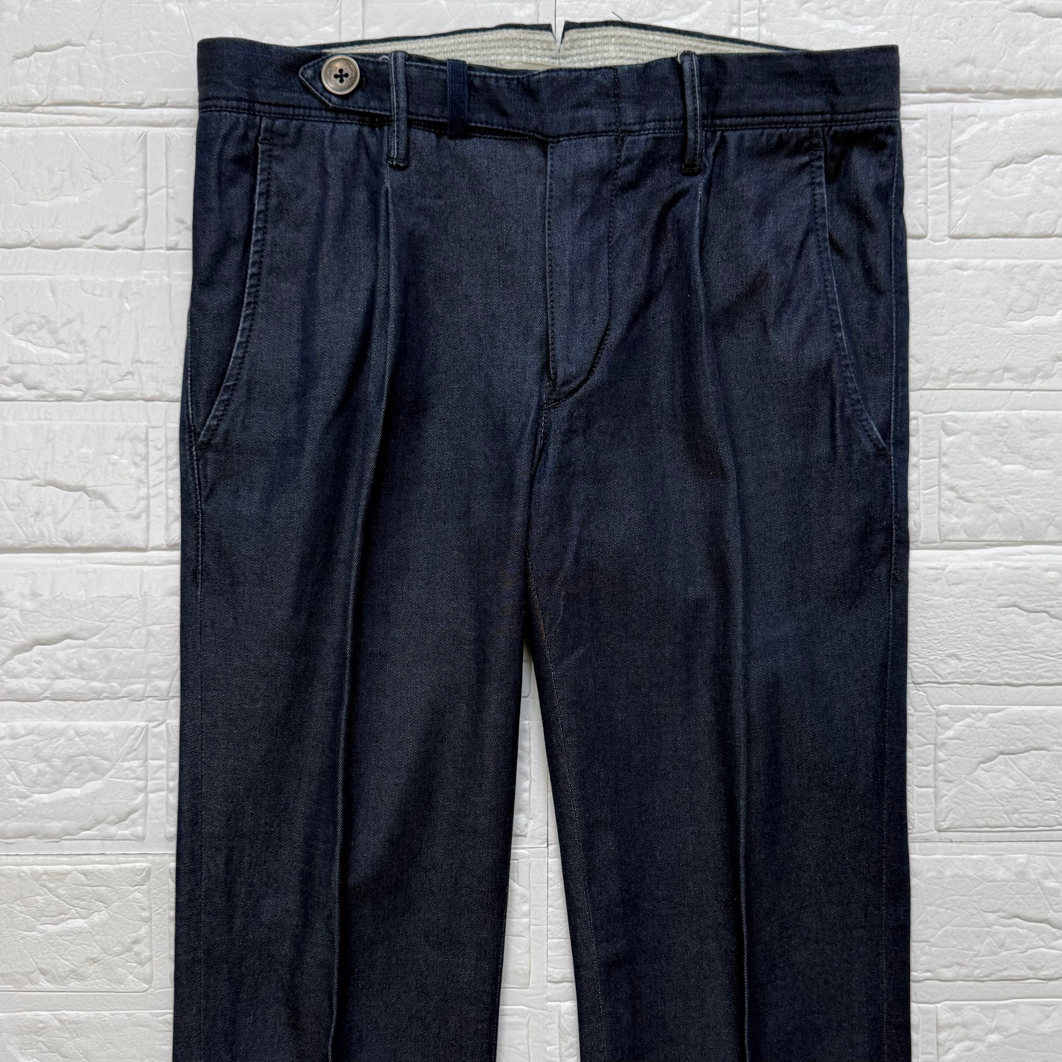濃いインディゴカラーとシャープなシルエットが、モダンな雰囲気のデニムスラックスです。