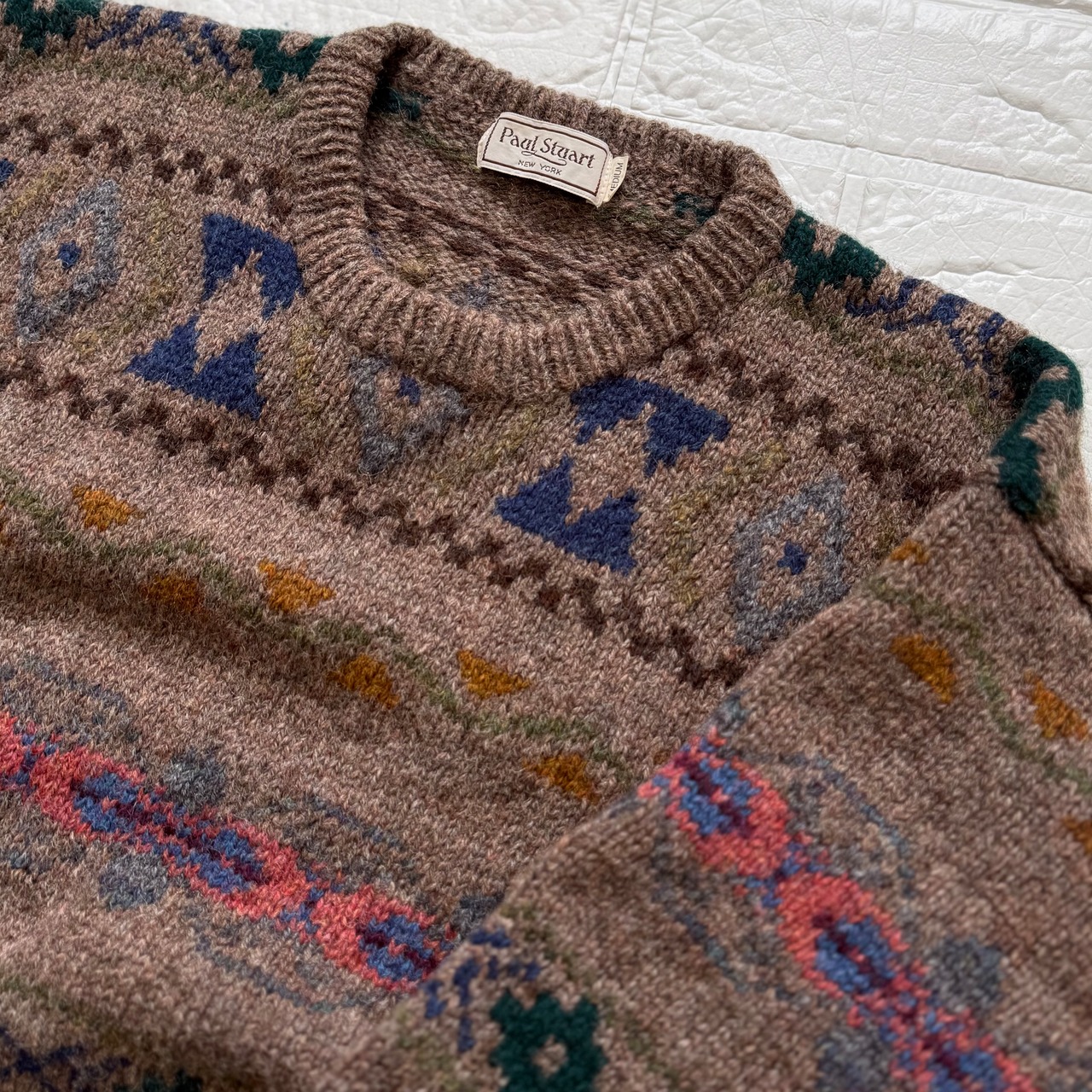 丁寧に編み上げられたブリティッシュカントリーテイストな総柄と纏まりある多配色の掛け合わせが、ポールスチュアートらしいコンテンポラリーな表情。