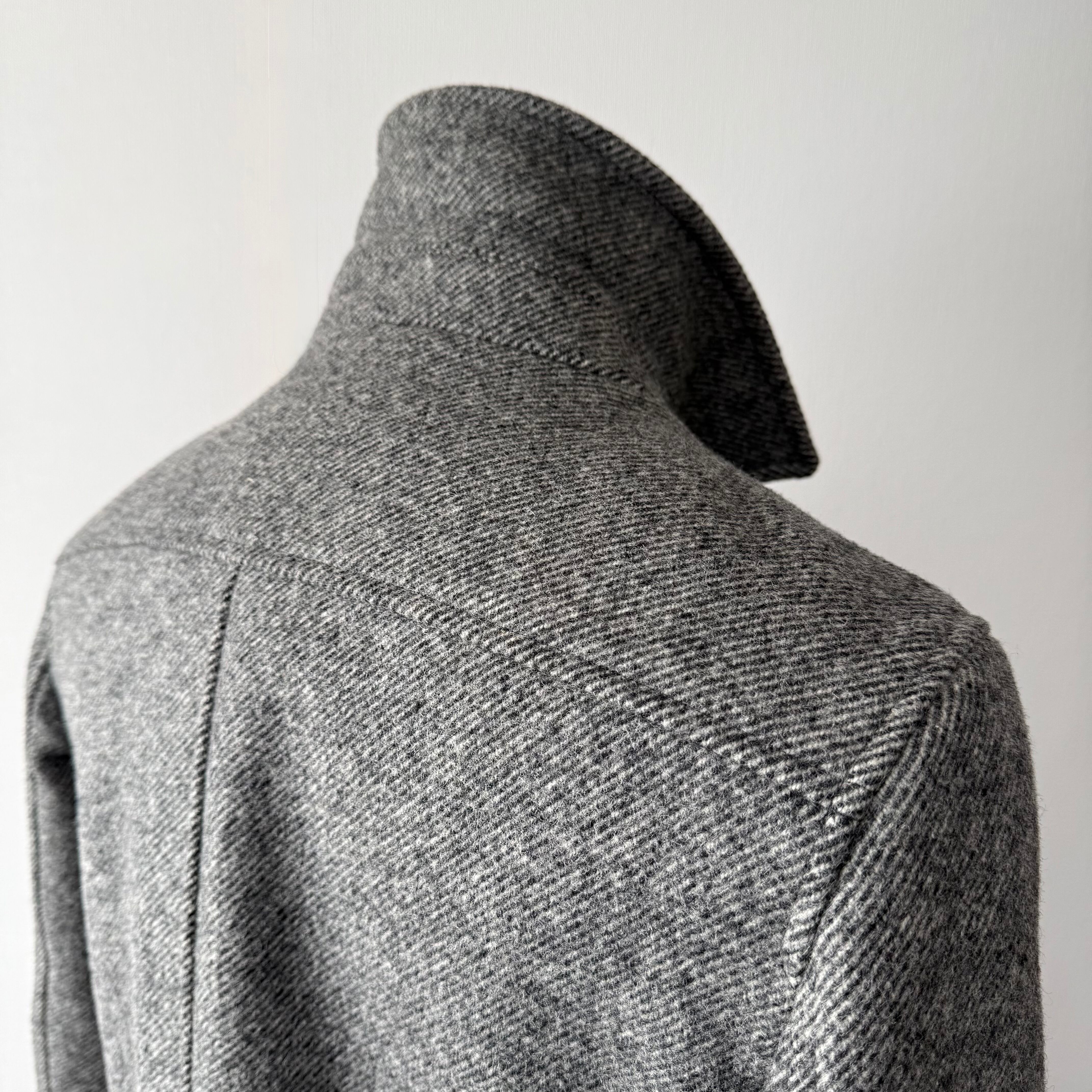 本来ならばスポーティでカジュアルな印象に映る短丈ながらも、グレーとチャコールグレーの色使いとウール生地の風合い、台襟仕様や袖カフス等のデザインを用いているので、フレンチブランドらしいシックでスマートなブルゾンに仕上がっております。