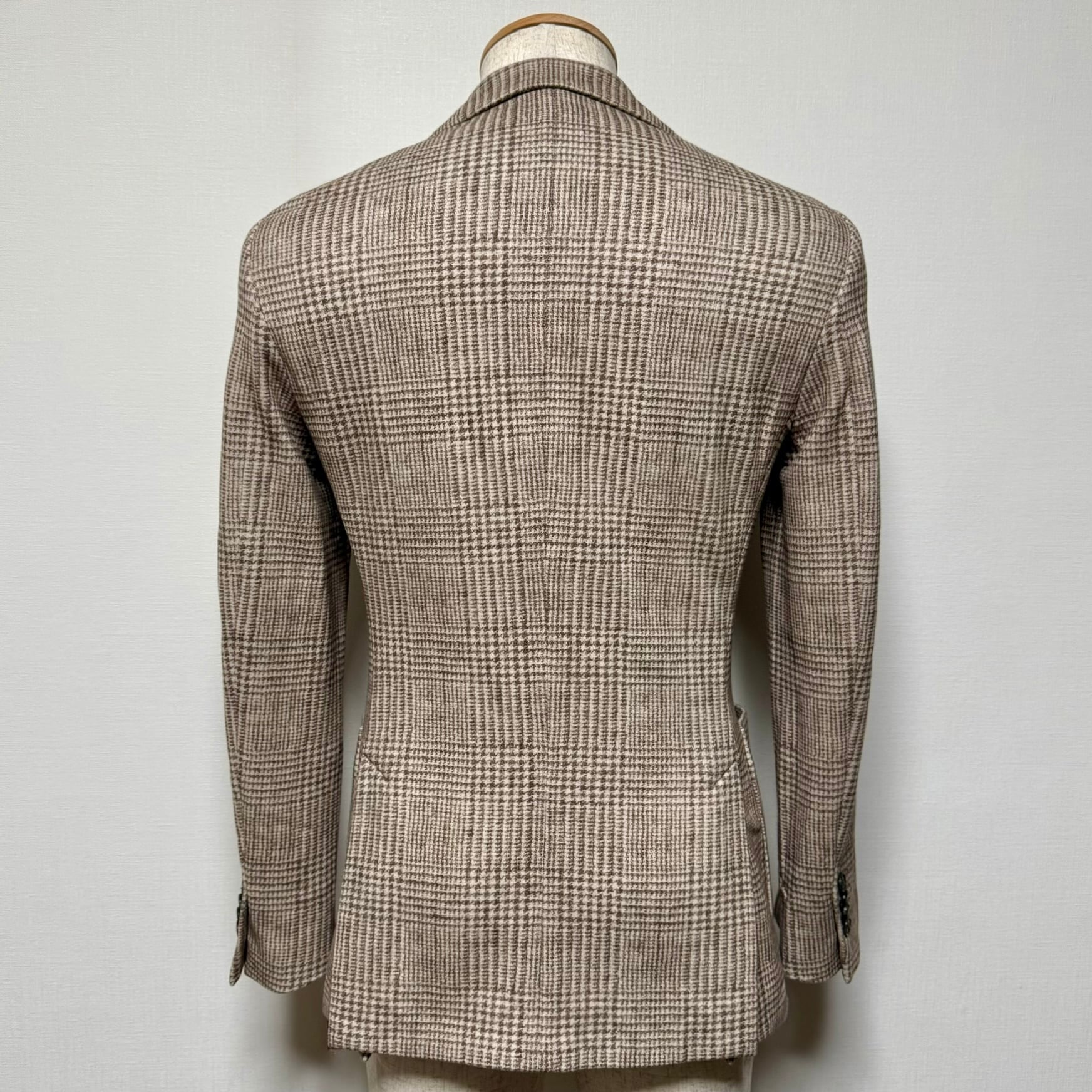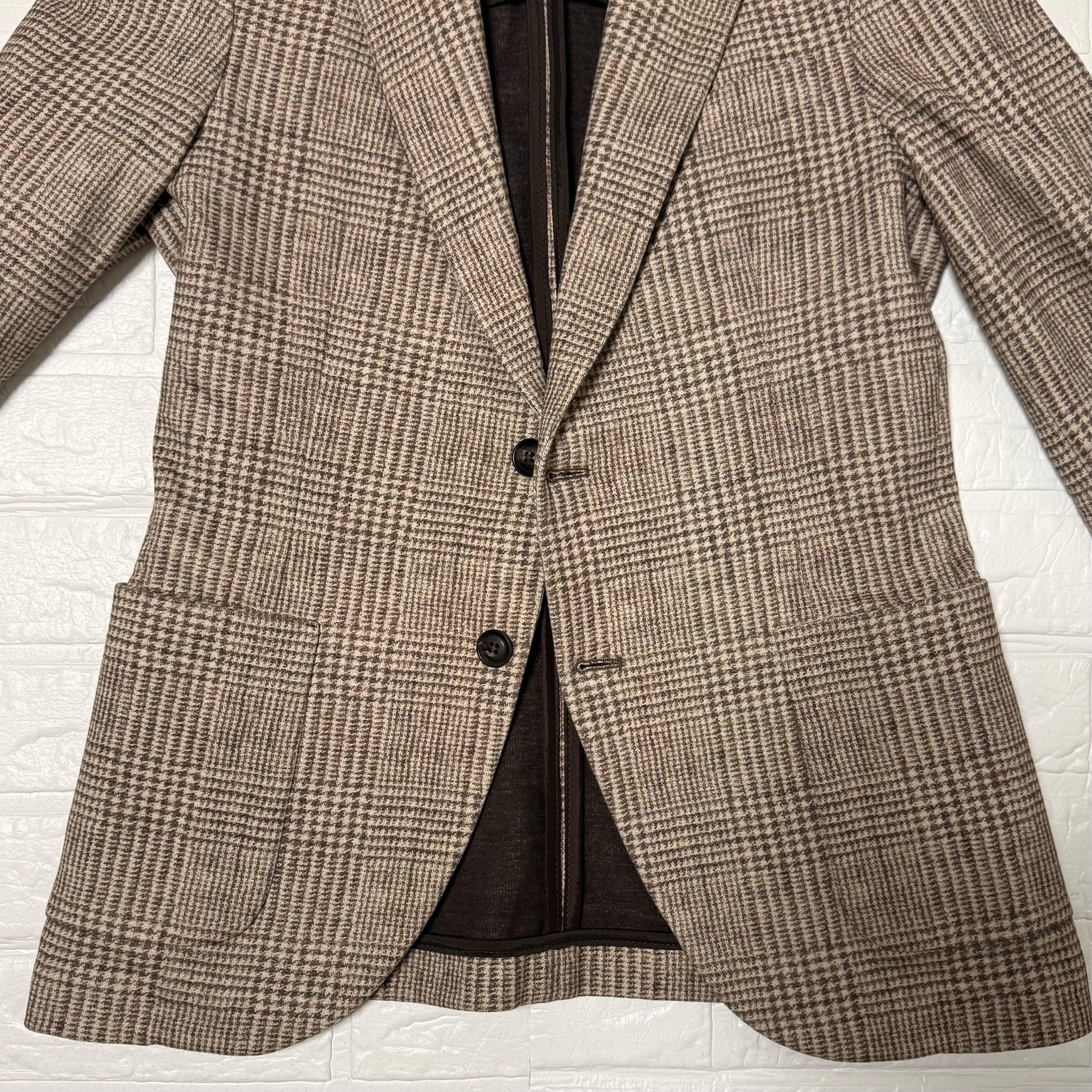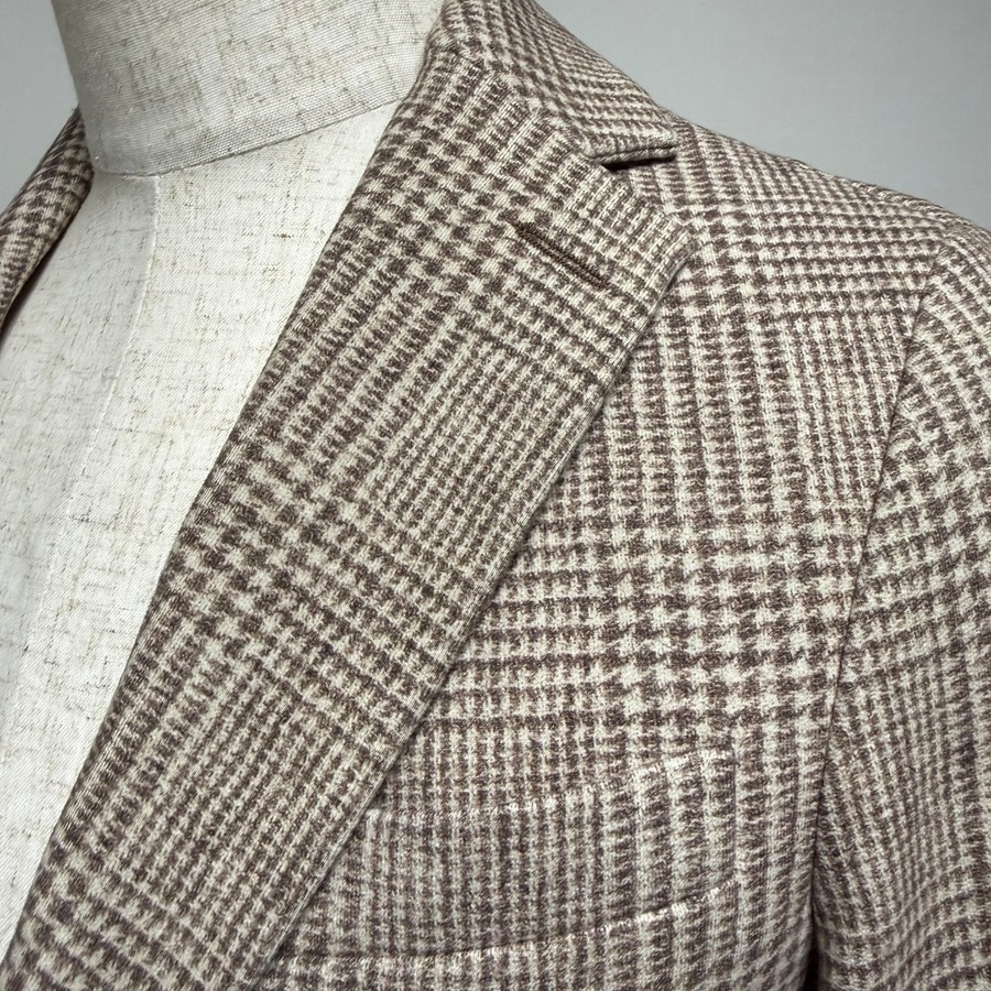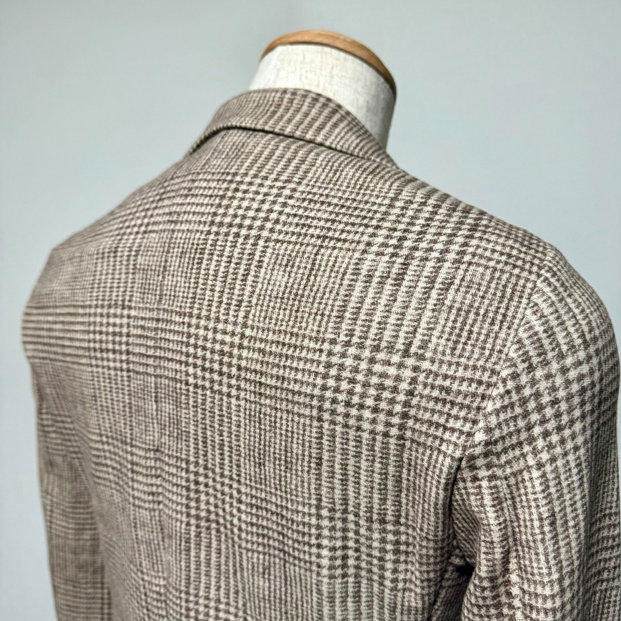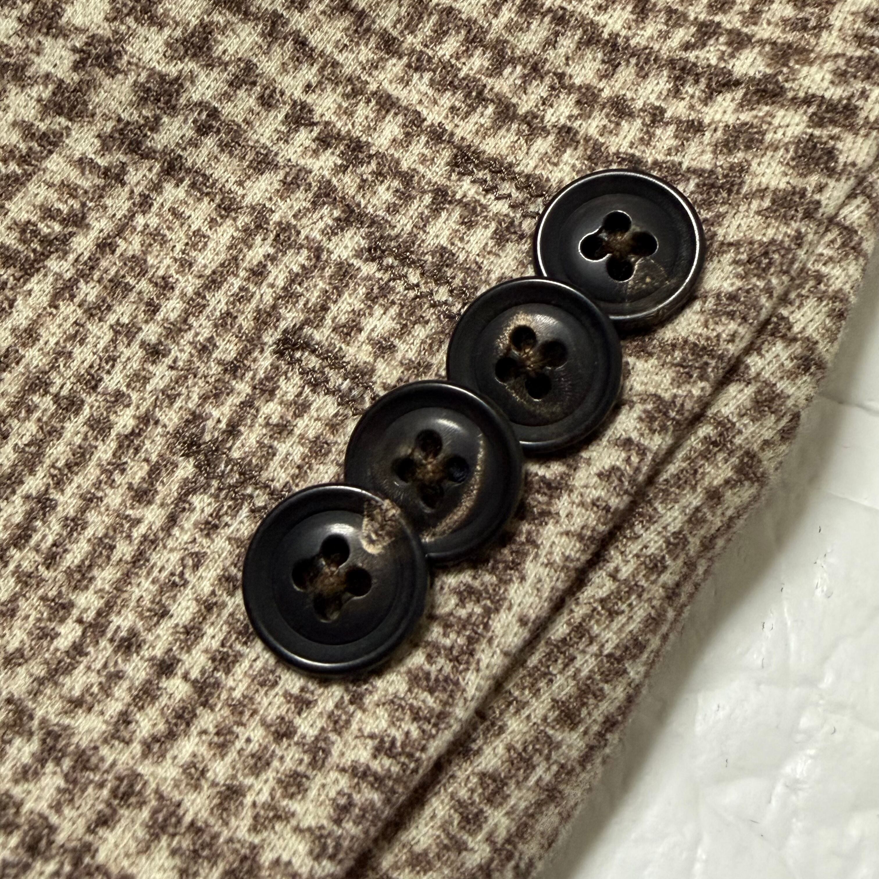 フロント2釦、袖ミシン切羽+重ね釦、袖口額縁仕上げ、背抜き、サイドベンツの仕様。