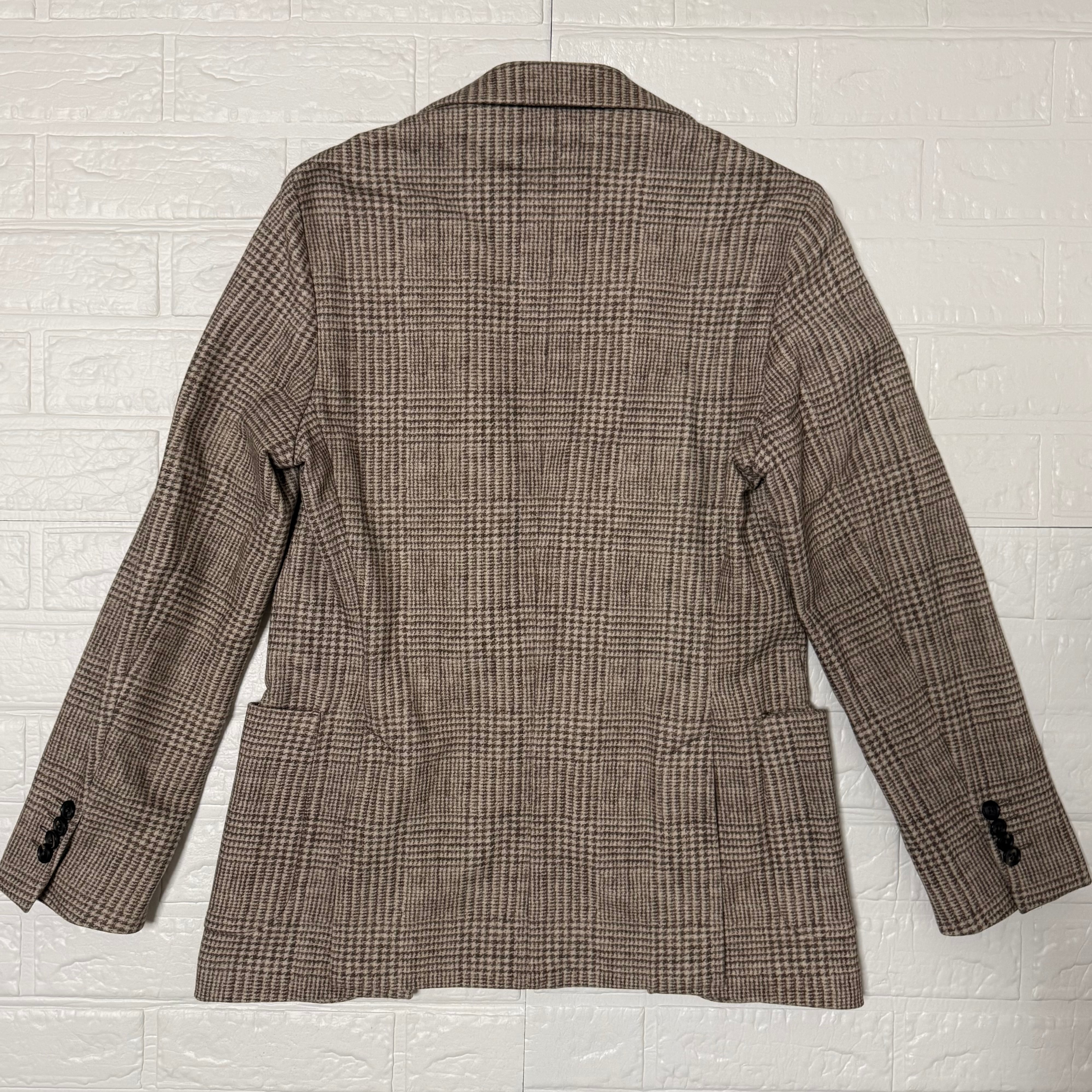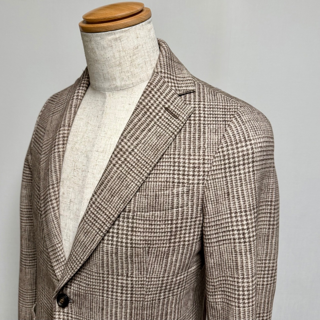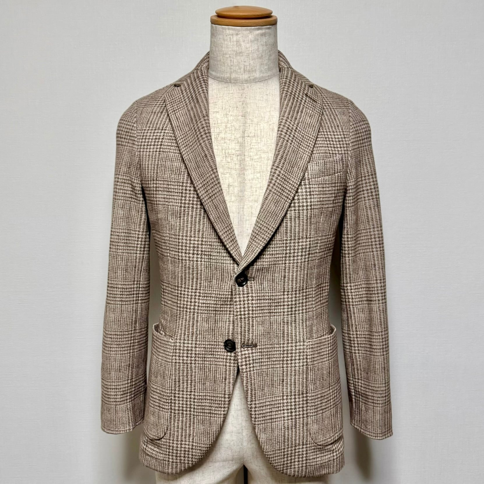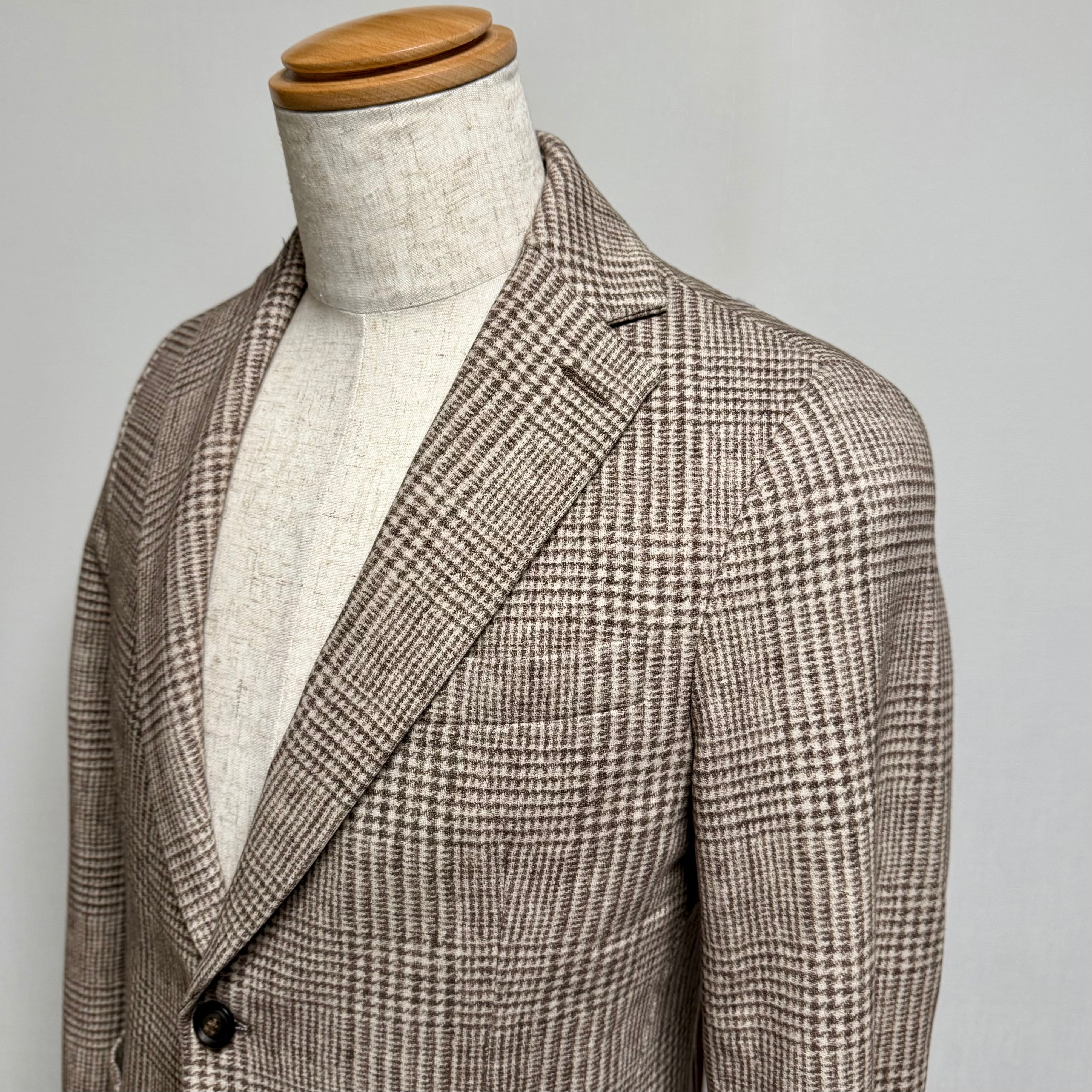 フロント2釦、袖ミシン切羽+重ね釦、袖口額縁仕上げ、背抜き、サイドベンツの仕様。