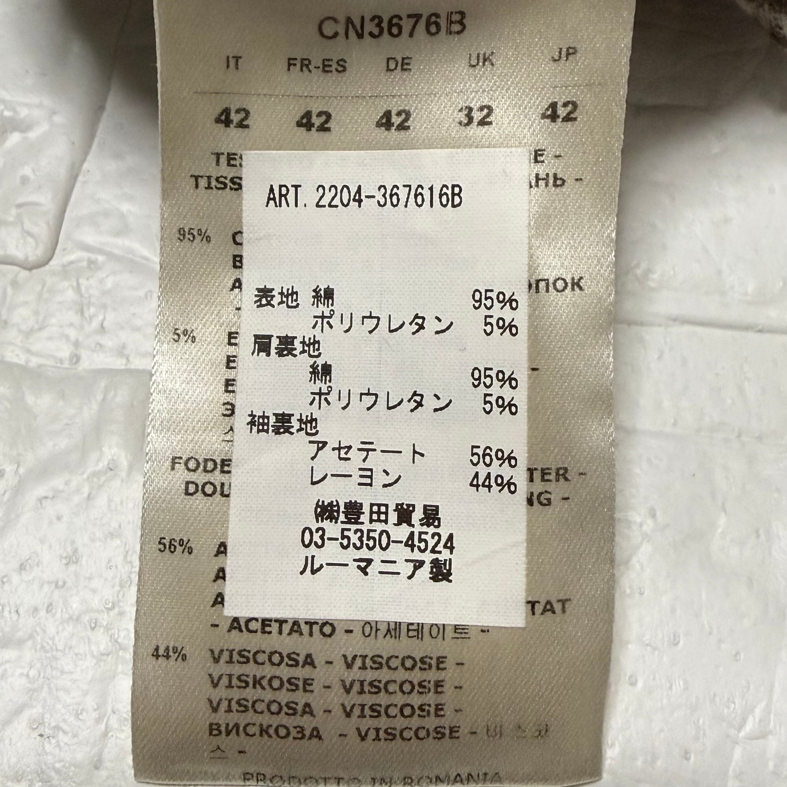 (表地)コットン95%、ポリウレタン5% (肩裏地)コットン95%、ポリウレタン5% (袖裏地)アセテート56%、レーヨン44%