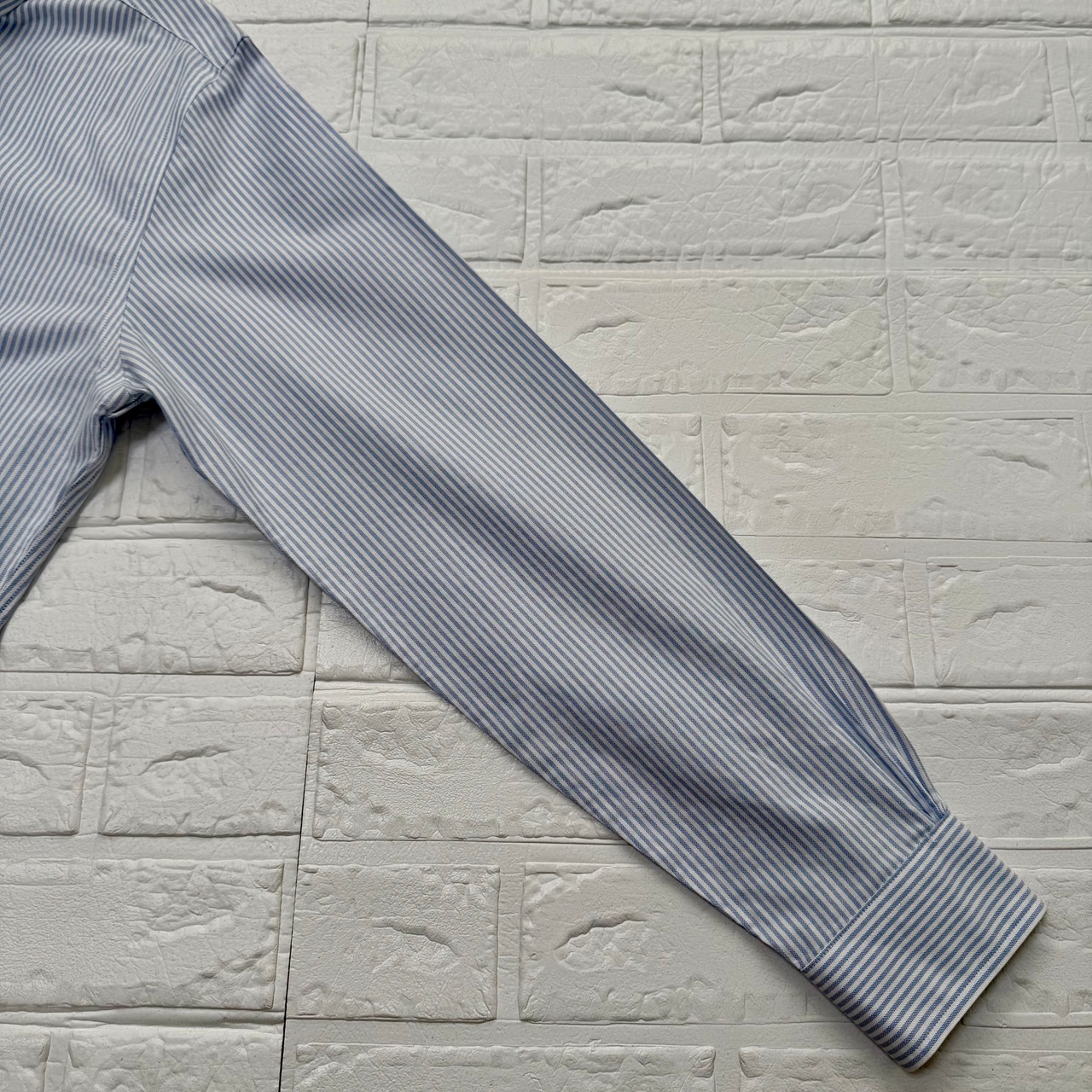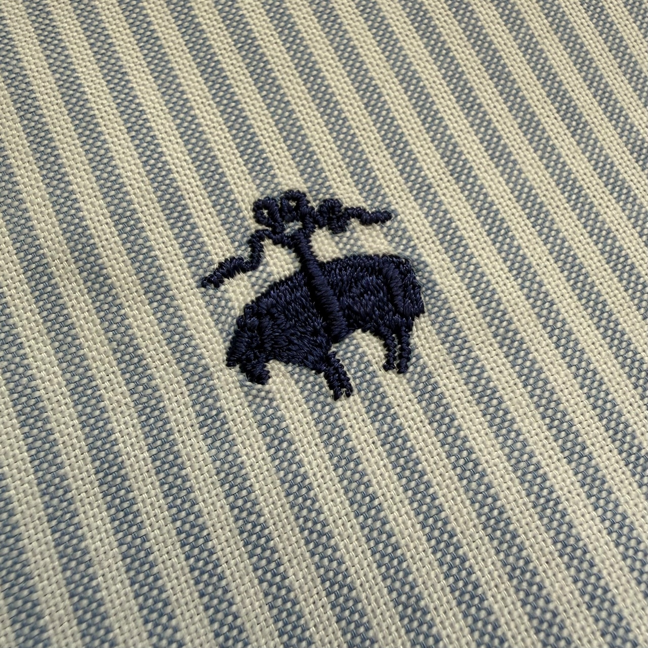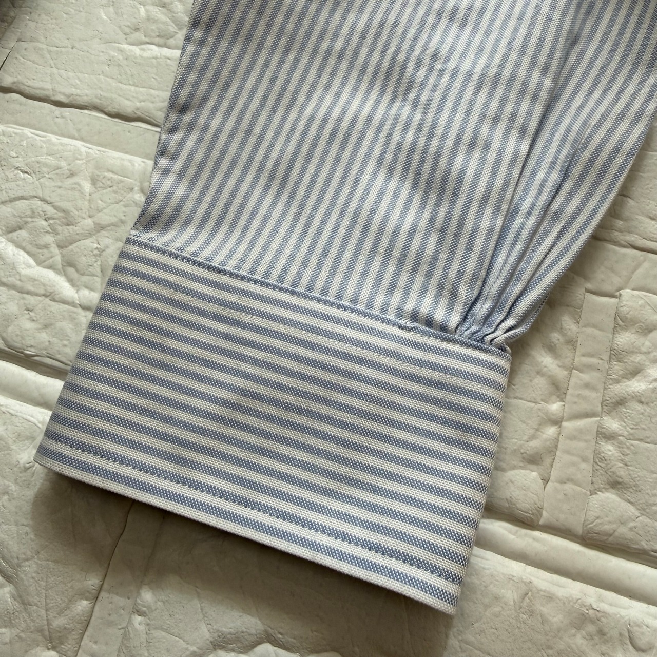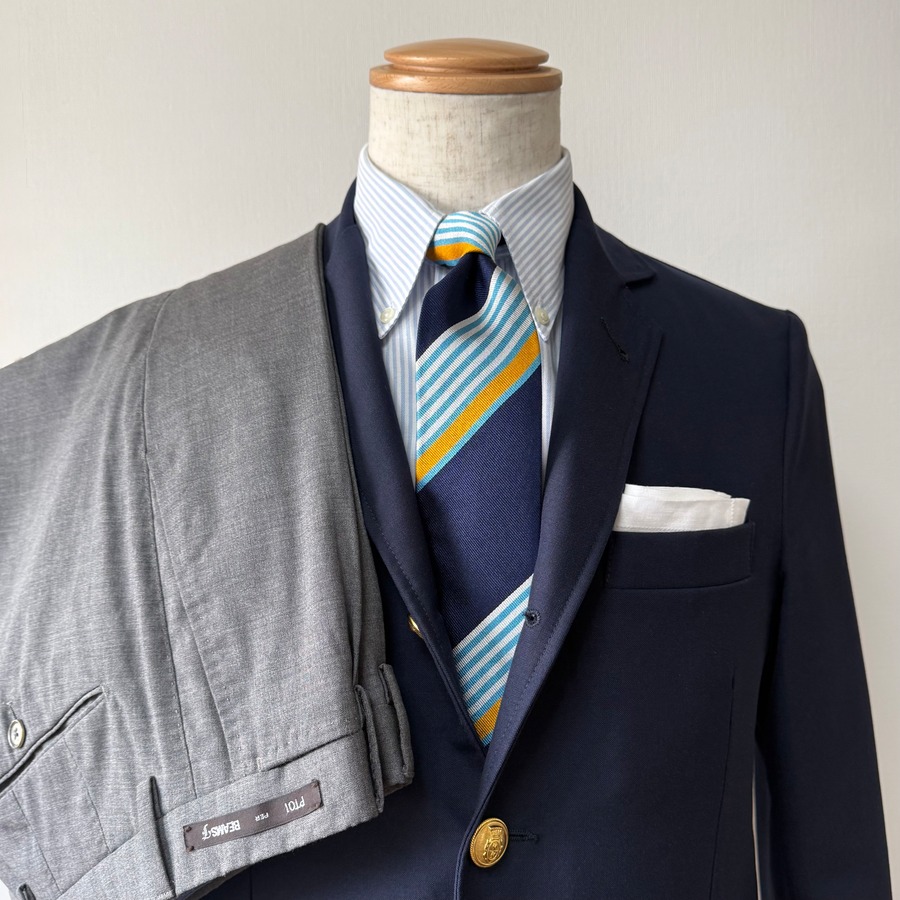 王道のブルー×ホワイトのストライプ柄は、トラッドらしい凛々しく爽やかな印象に。